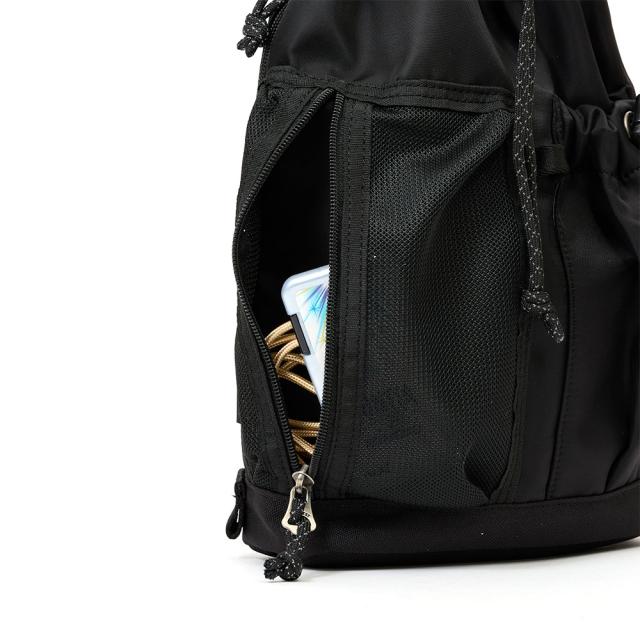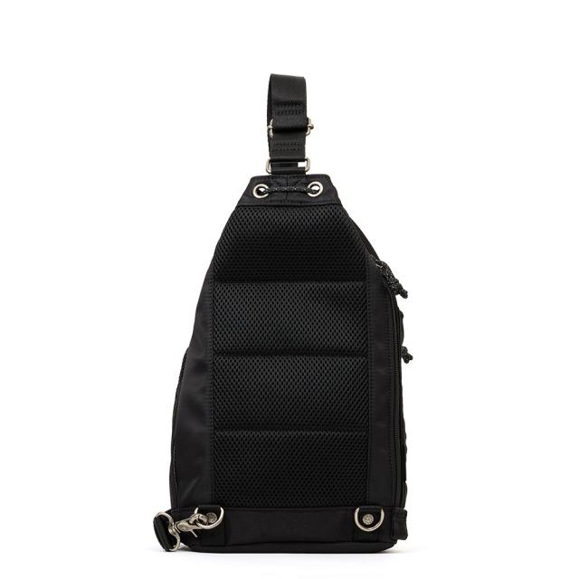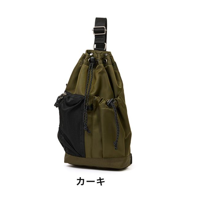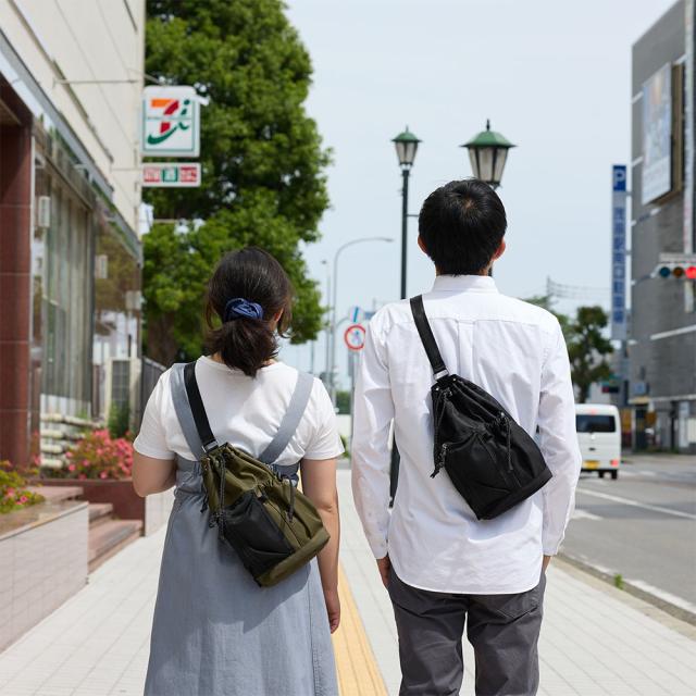 巾着型が特徴的なムスタッシュのボディバッグ。前のポケットには500mlペットボトルを収納できます。荷物の出し入れは背面のファスナーからも可能。男女・年齢関係なく使用でき、カラーもブラック・カーキ・マスタード・パープルの4色から選べます。