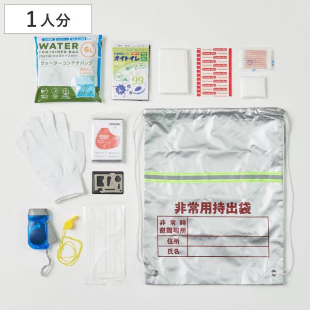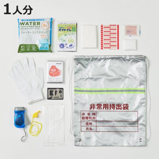 | 内容量 | 1セット 非常用袋・万能カッター・ホイッスル・アルミブランケット・手動式懐中電灯・軍手・水に流せるティッシュ・マスク・絆創膏・綿棒・コットン・ウォーターコンテナバック6L・オイトイレ1回分 |