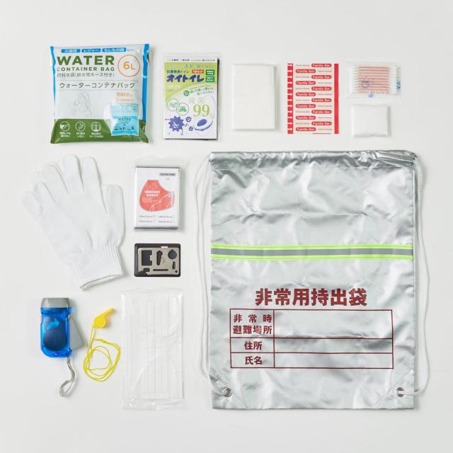 非常用袋・万能カッター・ホイッスル・アルミブランケット・手動式懐中電灯・軍手・水に流せるティッシュ・マスク・絆創膏・綿棒・コットン・ウォーターコンテナバック6L・オイトイレ1回分