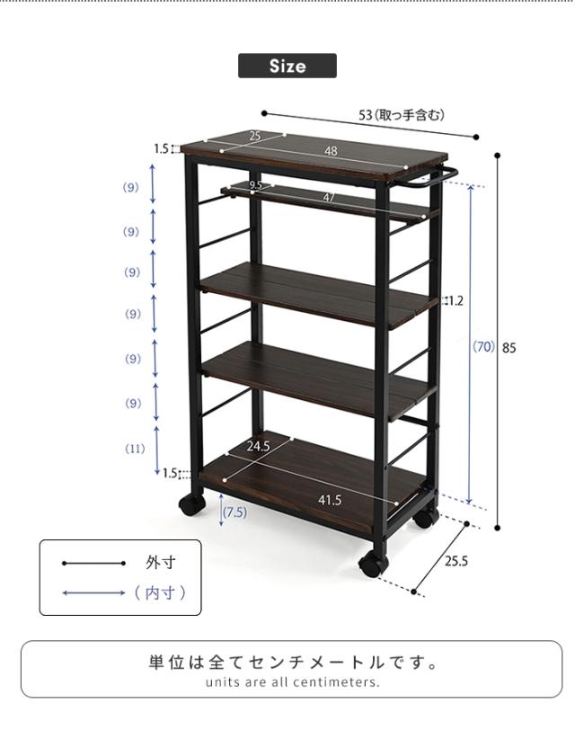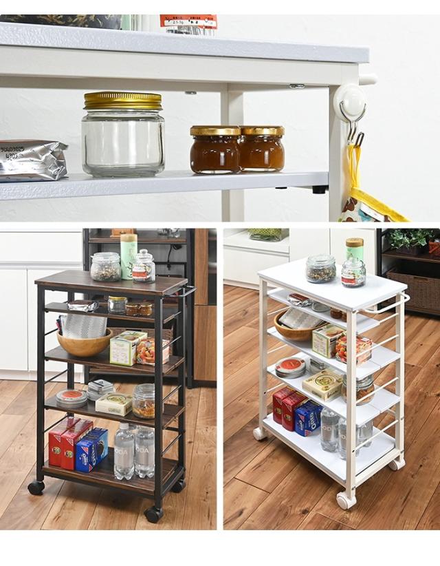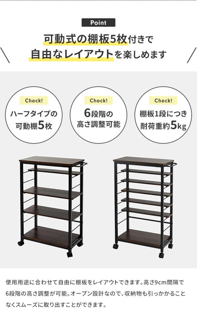 ・可動式の棚板5枚付き。高さ9cm間隔で6段階の調節ができる自由度の高いワゴン。
