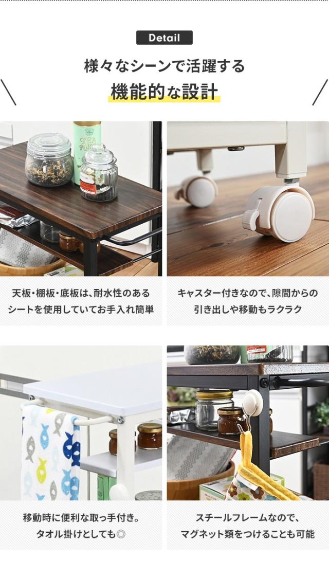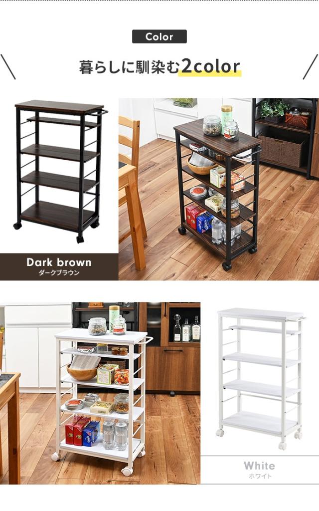 | ・必要な時に必要な場所へ。取っ手とキャスター付きでらくらく移動。 ・可動式の棚板5枚付き。高さ9cm間隔で6段階の調節ができる自由度の高いワゴン。 |
