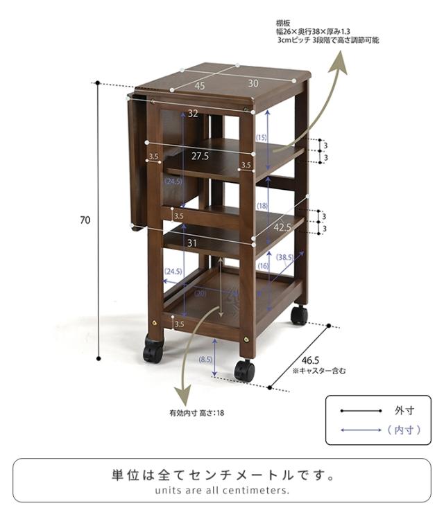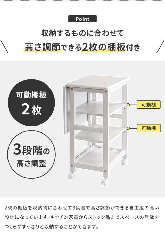 | ・天板を折りたたんで、本体をコンパクトに収納できます。 ・天板を折りたんだ時のサイズ(約):幅32×奥行45×高さ70。 ・2枚の棚板を収納物に合わせて3段階で高さ調節ができる自由度の高い設計になっています。 ・キャスター付きでらくらく移動。 |