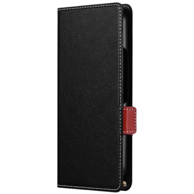 サイドベルトがバイカラーになった遊び心ある手帳型ケース。ピタッと固定できるマグネット仕様。すぐ取り出せて嵩張らないカード収納ポケット(1枚)。動画視聴に最適なスタンド機能。ショルダーストラップが使える2つのホール搭載