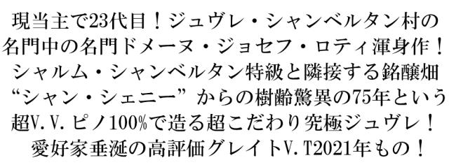 現当主で23代目!ジュヴレ・シャンベルタン村の 名門中の名門ドメーヌ・ジョセフ・ロティ渾身作! シャルム・シャンベルタン特級と隣接する銘醸畑 “シャン・シェニー”からの樹齢驚異の75年という 超V.V.ピノ100%で造る超こだわり究極ジュヴレ! 愛好家垂涎の高評価グレイトV.T2021年もの!