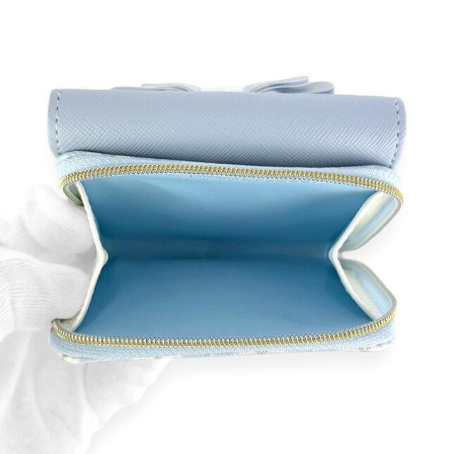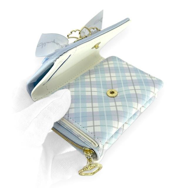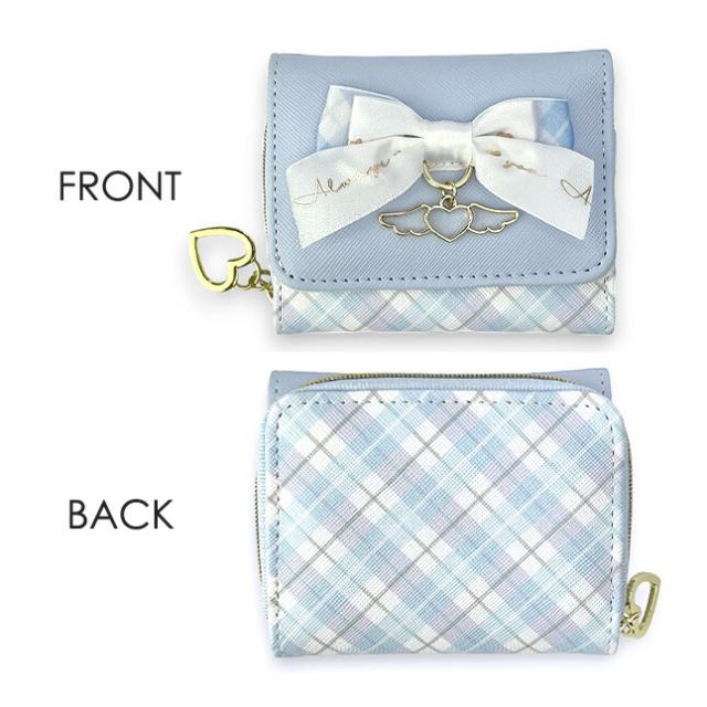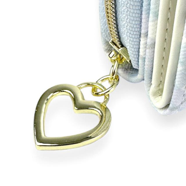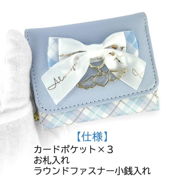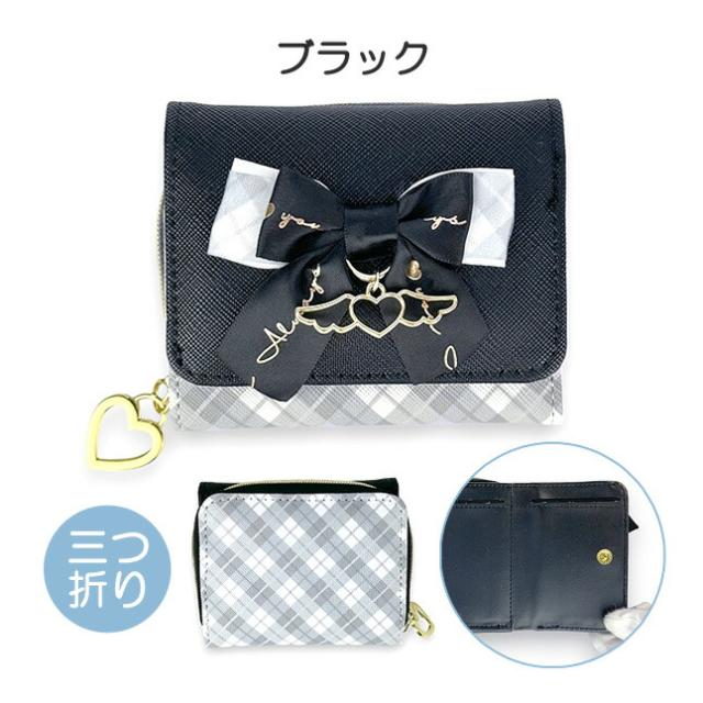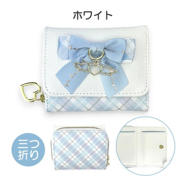 フロントの大きいリボンとハートと天使の羽のチャームかわいい三つ折り財布。