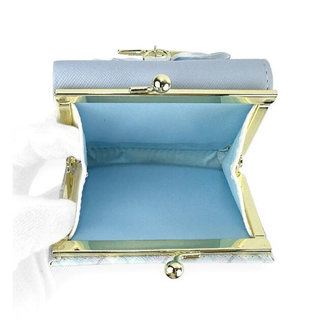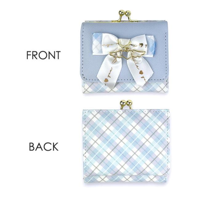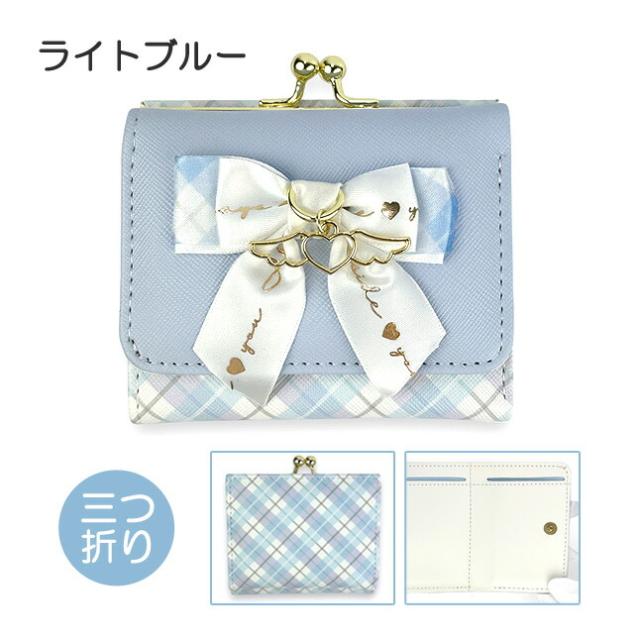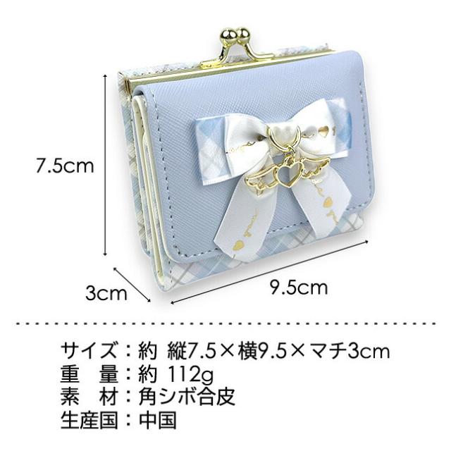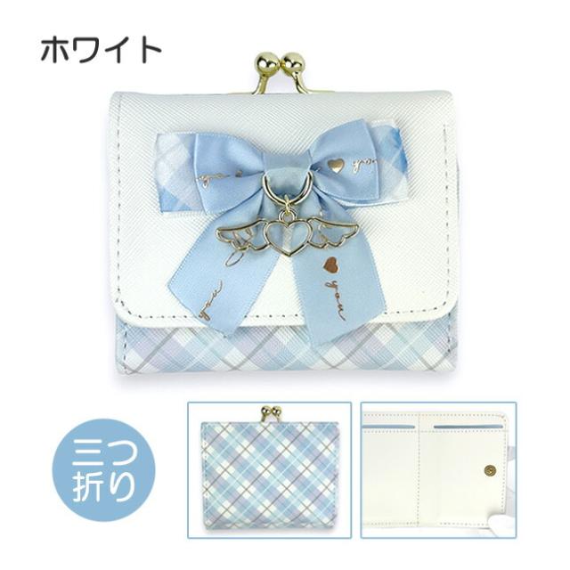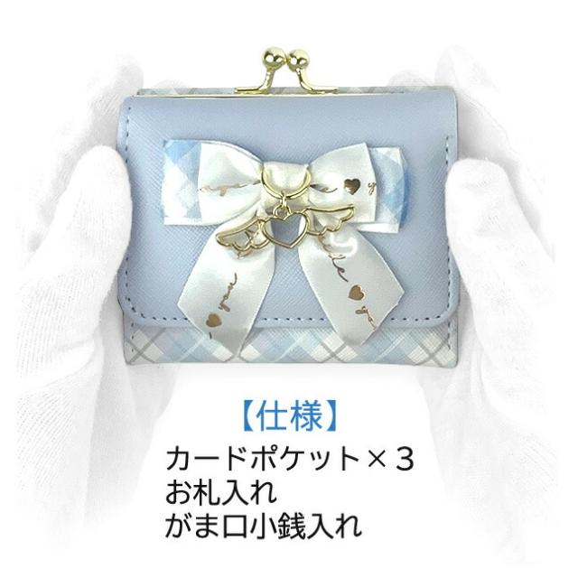フロントの大きいリボンとハートと天使の羽のチャームかわいいがま口三つ折り財布。