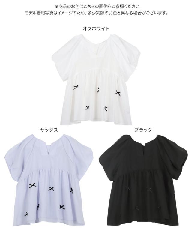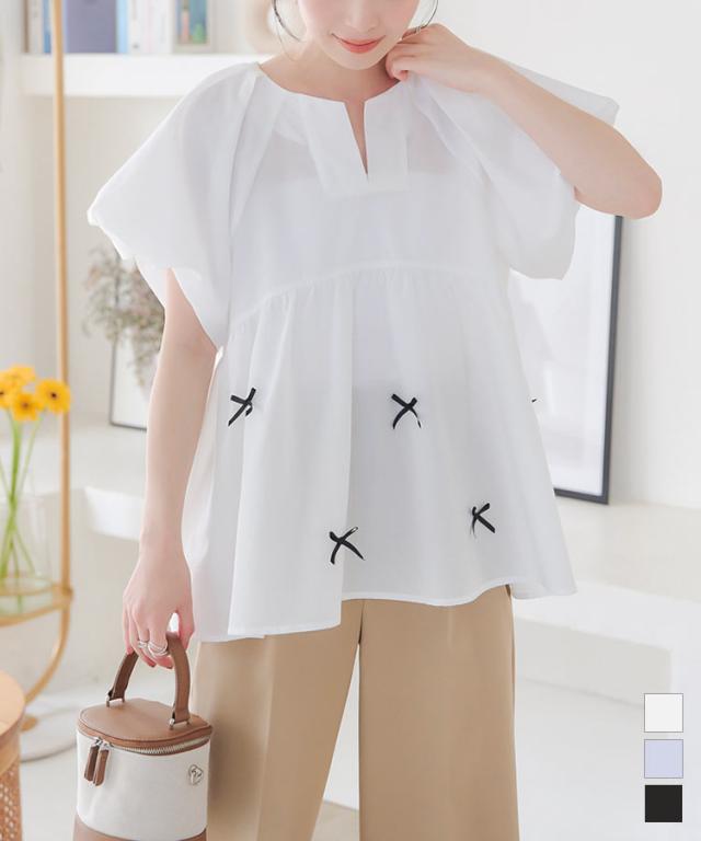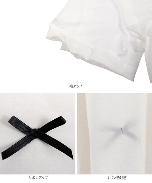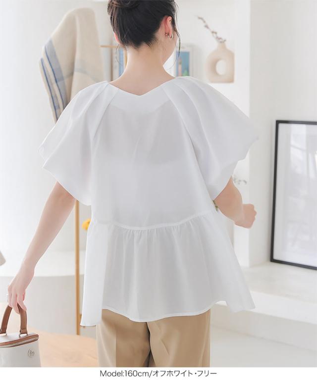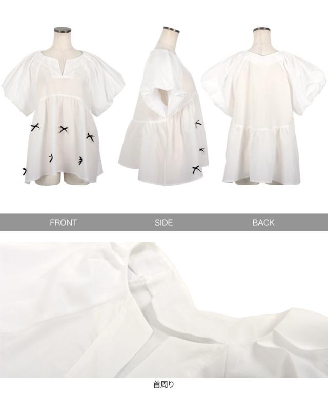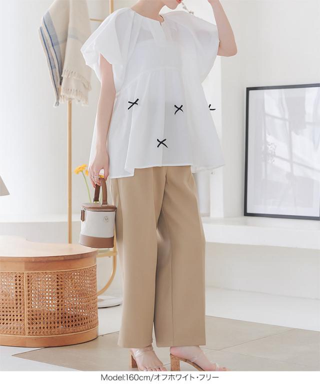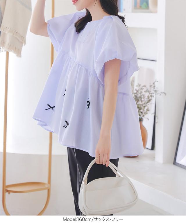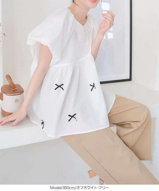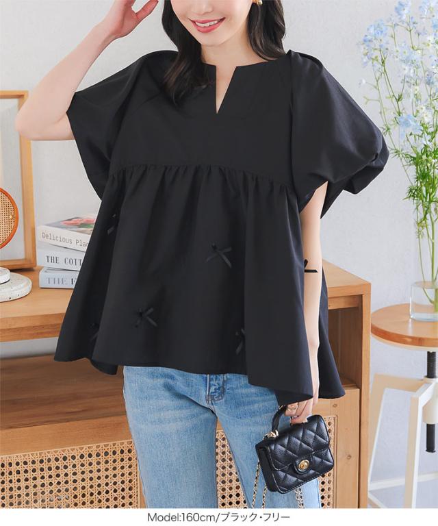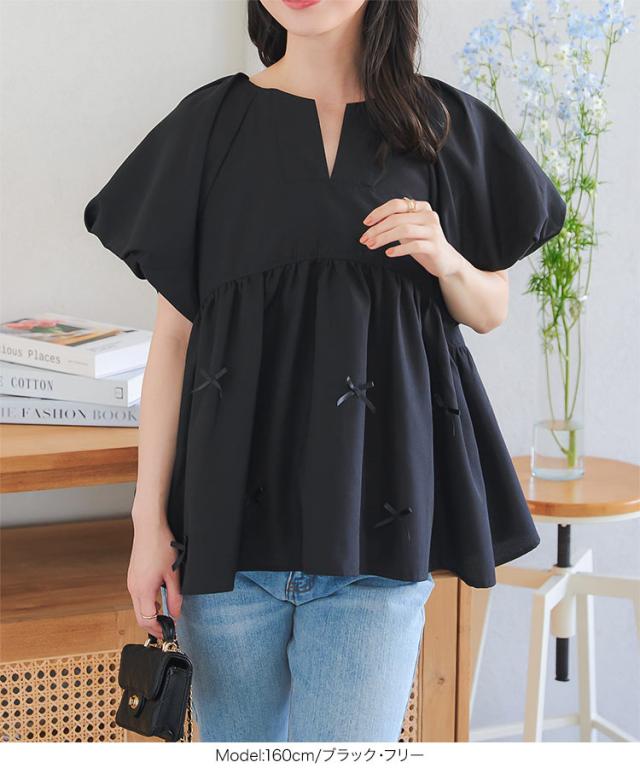 春新作 リボンモチーフペプラムブラウス C7155 入荷済 レディース 20代 30代 40代 リボンモチーフ ペプラムブラウス リボン モチーフ ペプラム ブラウス トップス チュニック フレア 体型カバー スキッパー キーネック パフスリーブ