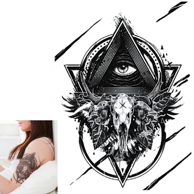 大きいサイズの黒色ブラックでリ三角形のトライアングルピラミッドに目をデザインし山羊のドクロをモチーフにした水で貼るフェイクタトゥ—ステッカー。