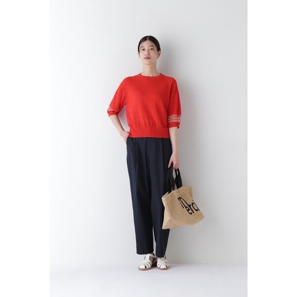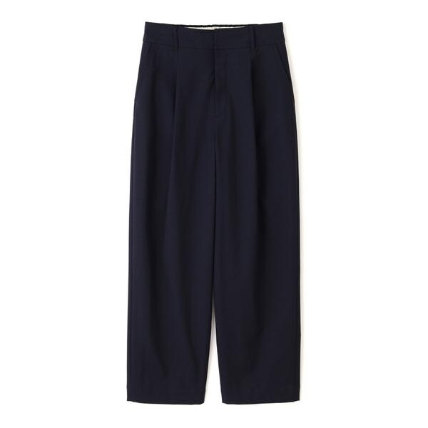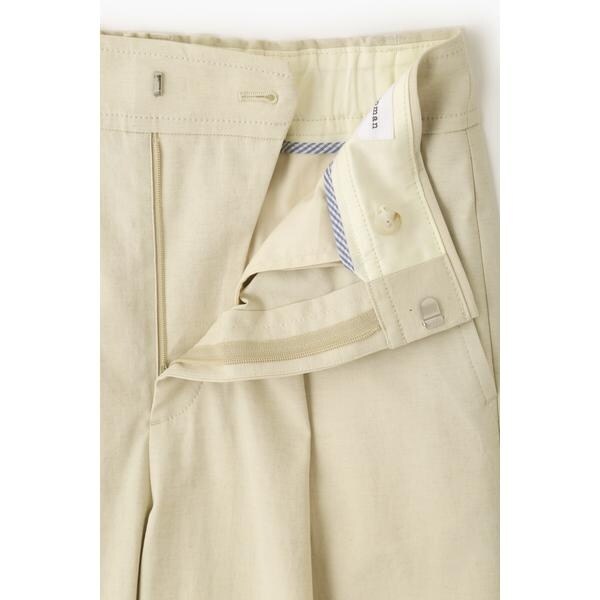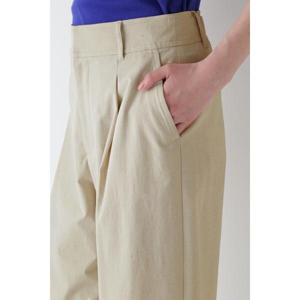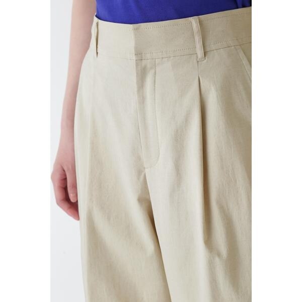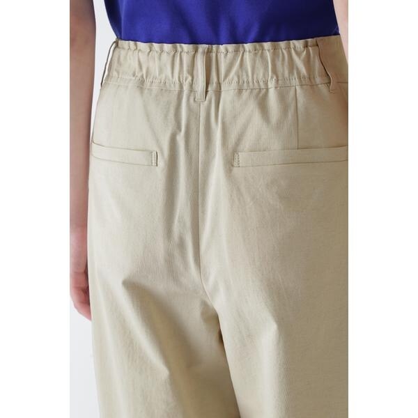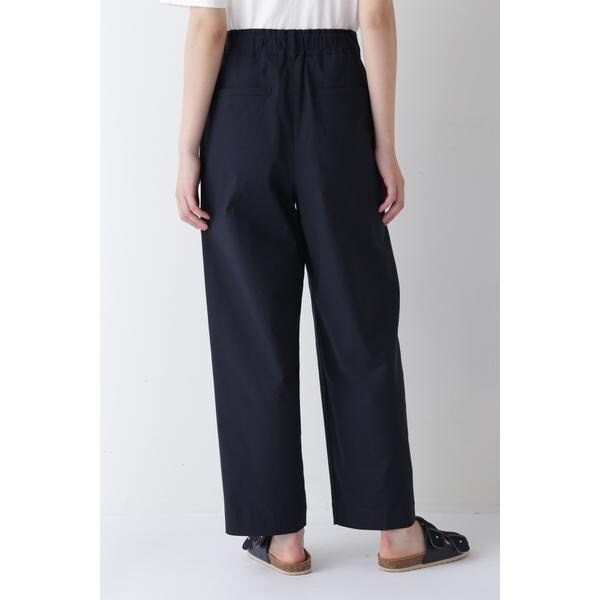 タックが入り、腰回りはゆったりとしたバレルシルエットのイージー仕様パンツ。きちんと感はありつつウエストベルトの後ろがゴム仕様なので快適に着ていただけます。