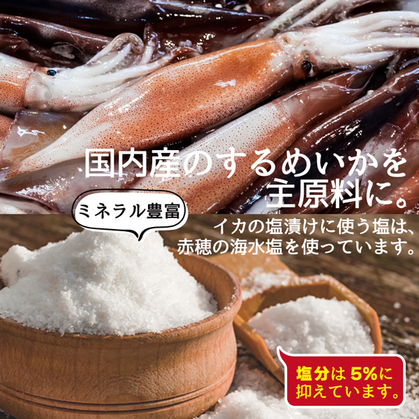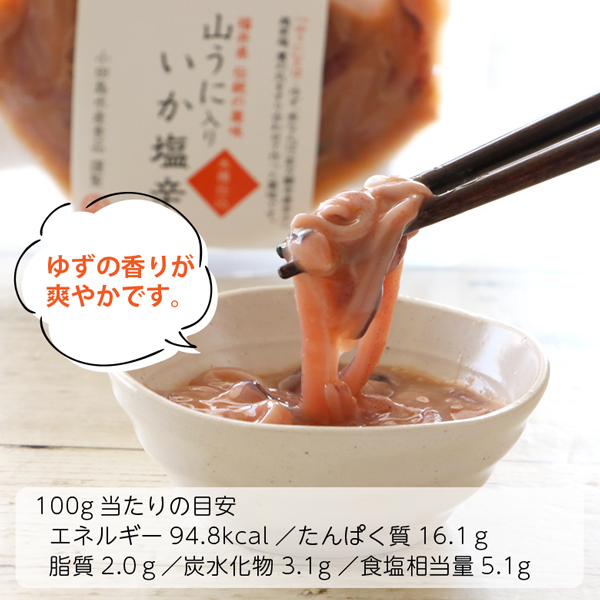 原材料名 :するめいか(国内産)、食塩、はちみつ、山うに(ゆず、赤万願寺唐辛子、食塩、唐辛子)/ソルビット、調味料(アミノ酸等)、甘味料(甘草、ステビア)、酸味料、増粘剤(キサンタンガム)(一部にいかを含む)