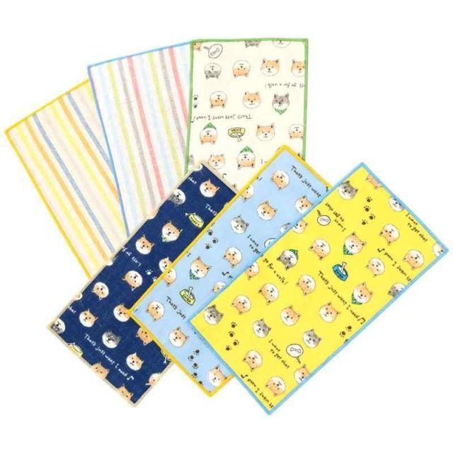 【キッズハーフハンカチ6枚/Y-shibaセット】しば犬柄4色(アイボリー・イエロー・ブルー・ネイビー)+ランダムで3種(ネイビーチェックorミックスストライプオレンジorミックスストライプグリーン)のうち2枚