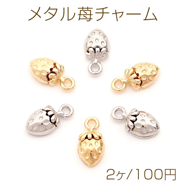 メタル苺チャーム 立体メタルチャーム いちごモチーフ メタルいちごチャーム ヘタあり 1カン付き 約6×11mm(2ヶ)