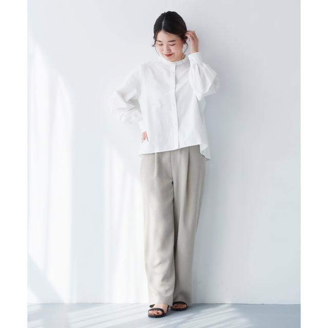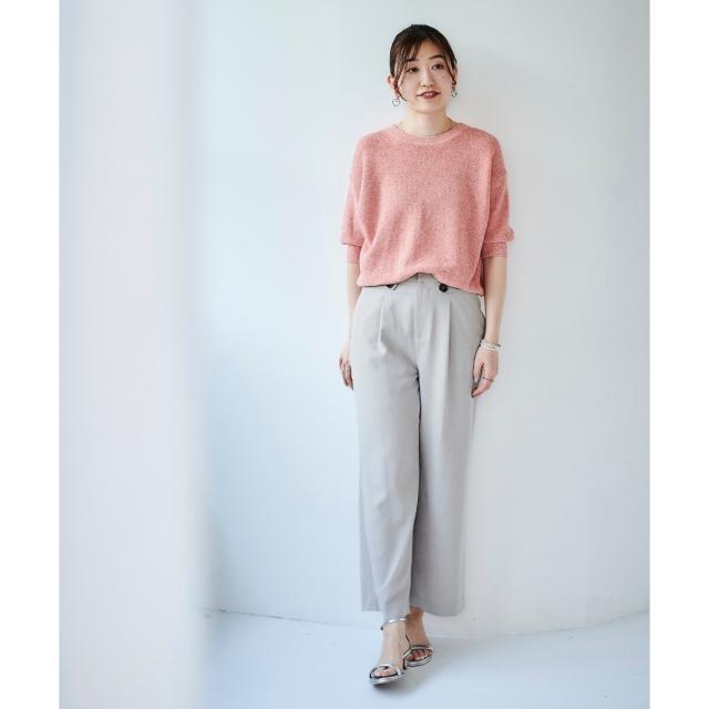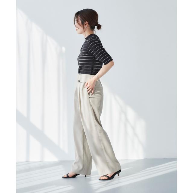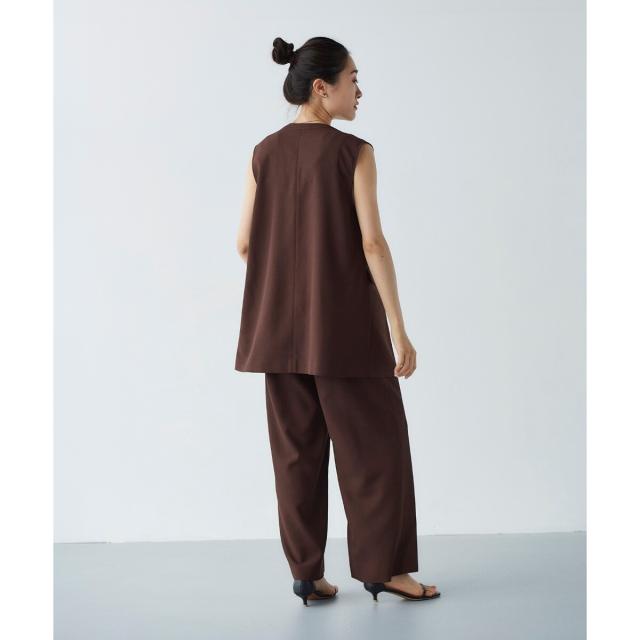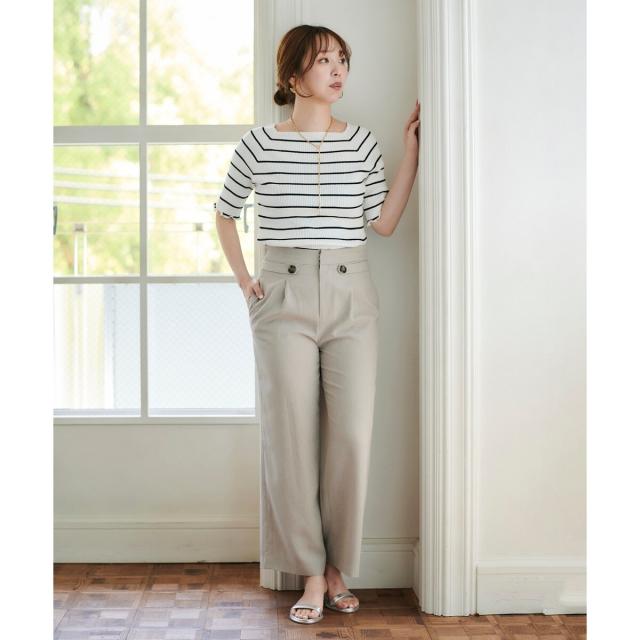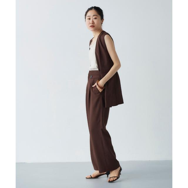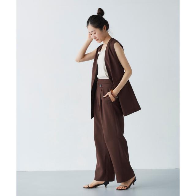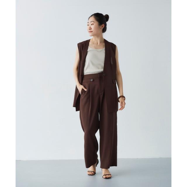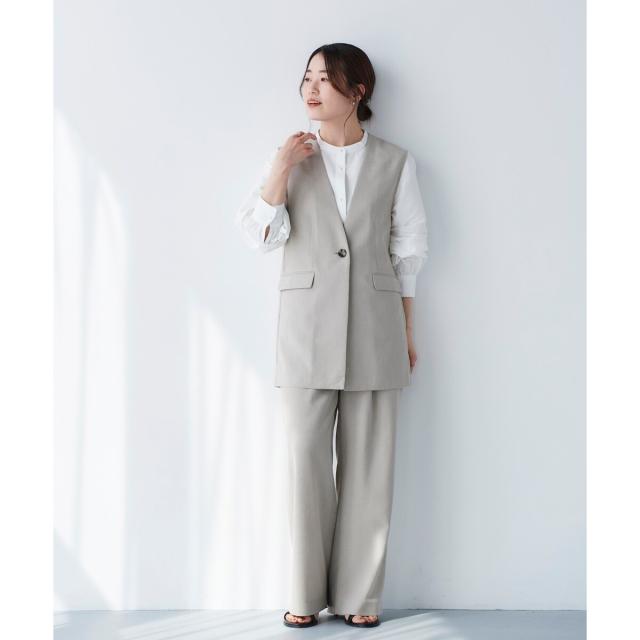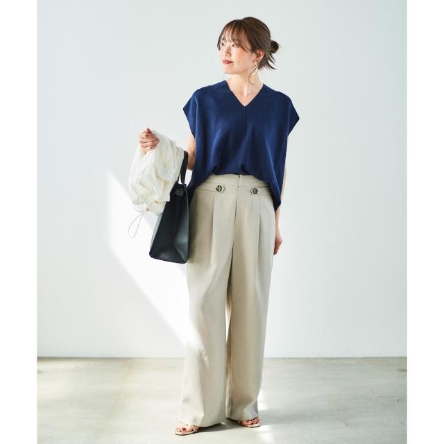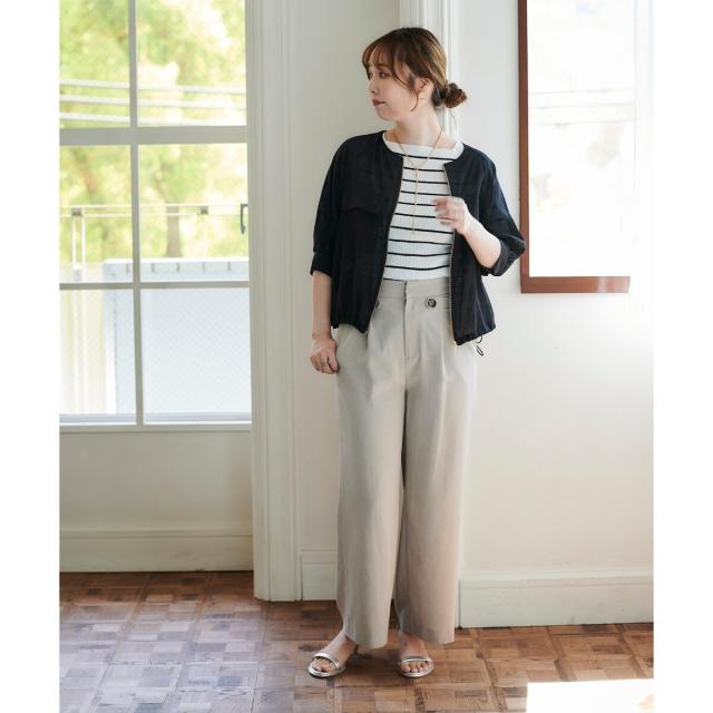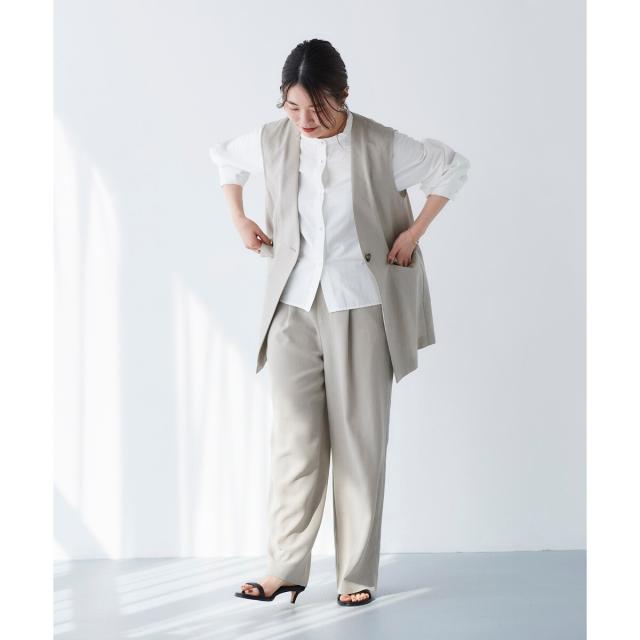 同素材シリーズのリネンライクツイルベスト(品番:3043075800)と合わせるのはもちろんのこと、少しフェミニンなトップスとの相性も抜群です。ミックススタイルが夏のスタイリッシュスタイルとしておすすめです。