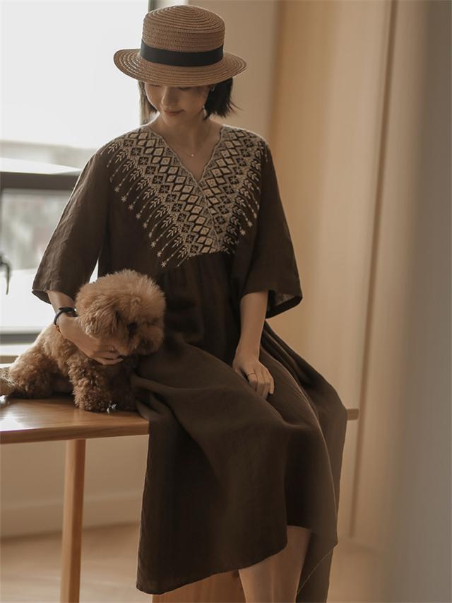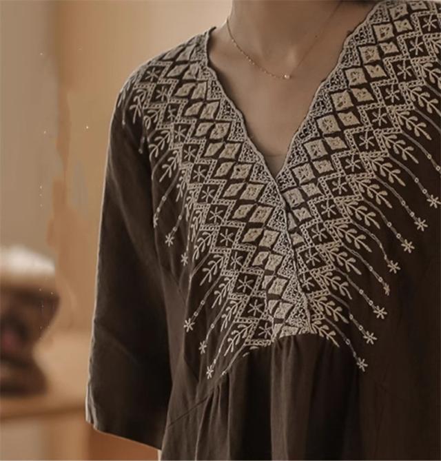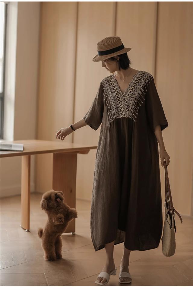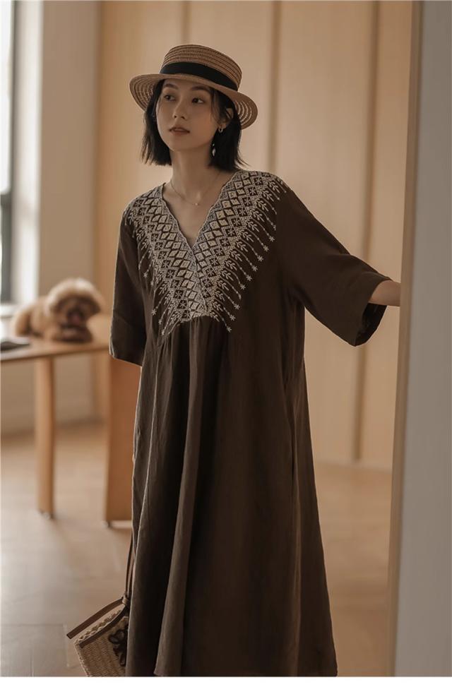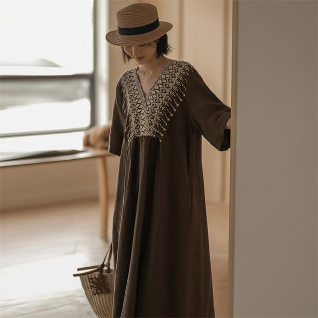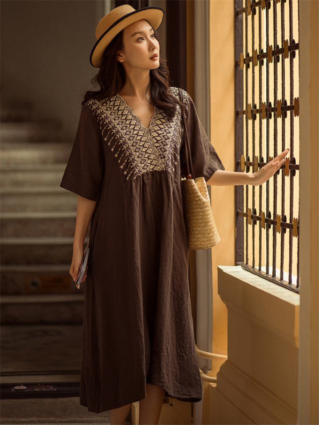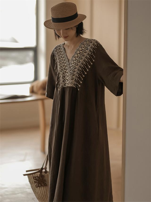 夏ワンピース 刺繍 レディース ロング丈 五分袖 Vネック 綿100% 大きいサイズ カフタンワンピース ちょっぴりレトロ感がある 大人ムードのワンピース