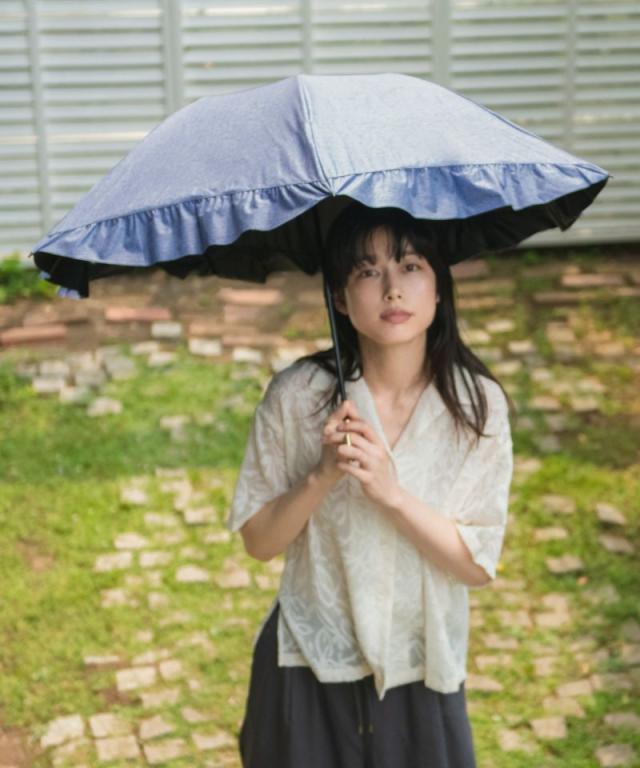 華やかで大きめのフリルを裾全体にあしらった、女性らしく上品な折りたたみ日傘。