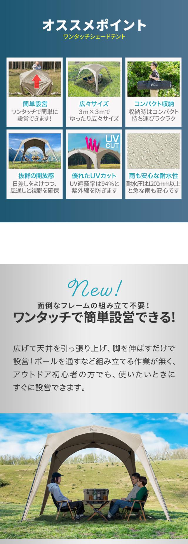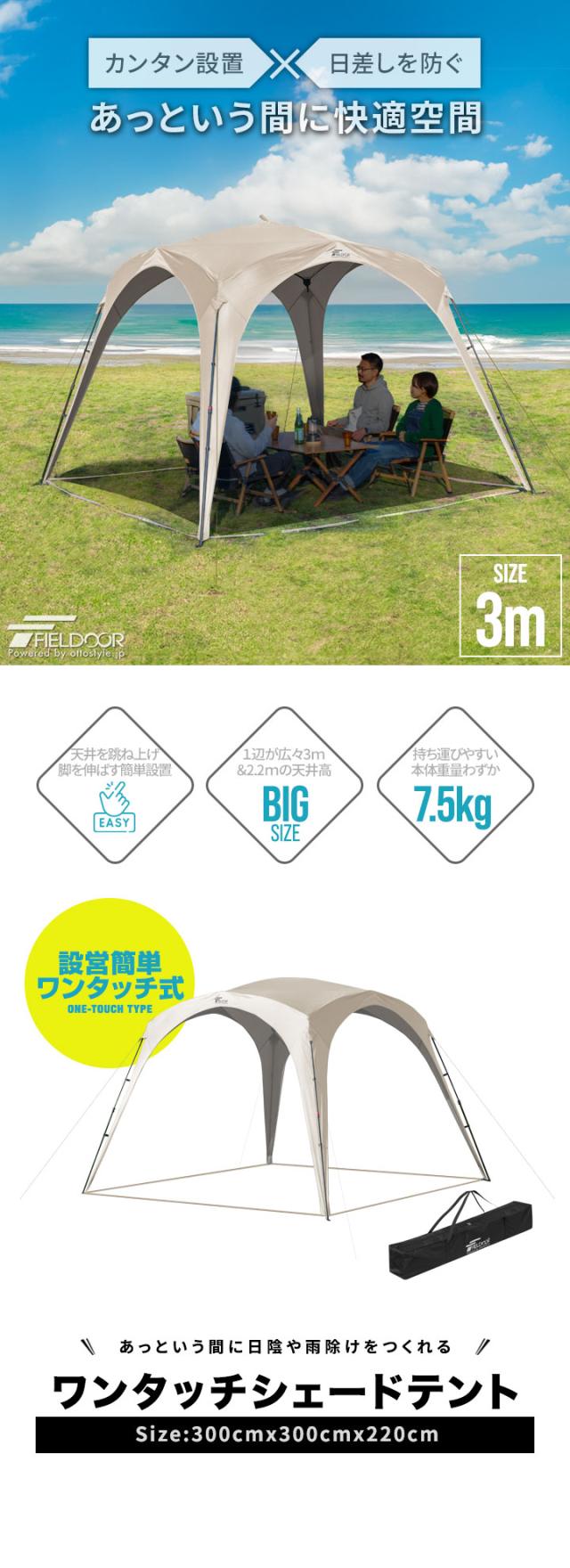 FIELDOOR 日よけ テント ワンタッチ ワンタッチシェードテント 300cm UVカット 耐水加工 2人〜4人 ワンタッチテント ポップアップテント 簡単 日除け 海 山 プール サンシェード シェルター タープ シェード 前室 簡易テント 1年保証 送料無料