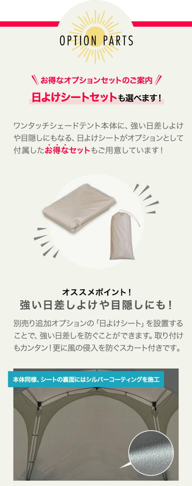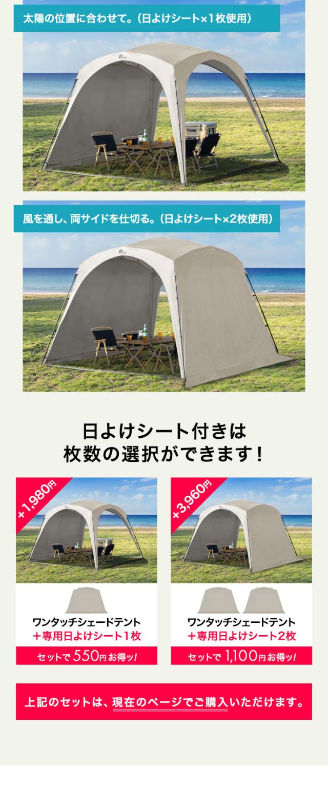 | ※[店舗管理用 URL]a07397 ※[品番]【シェードテント本体のみ:a07397】【日よけシート1枚付セット(+1980円):a07399】【日よけシート2枚付セット(+3960円):a07400】 |