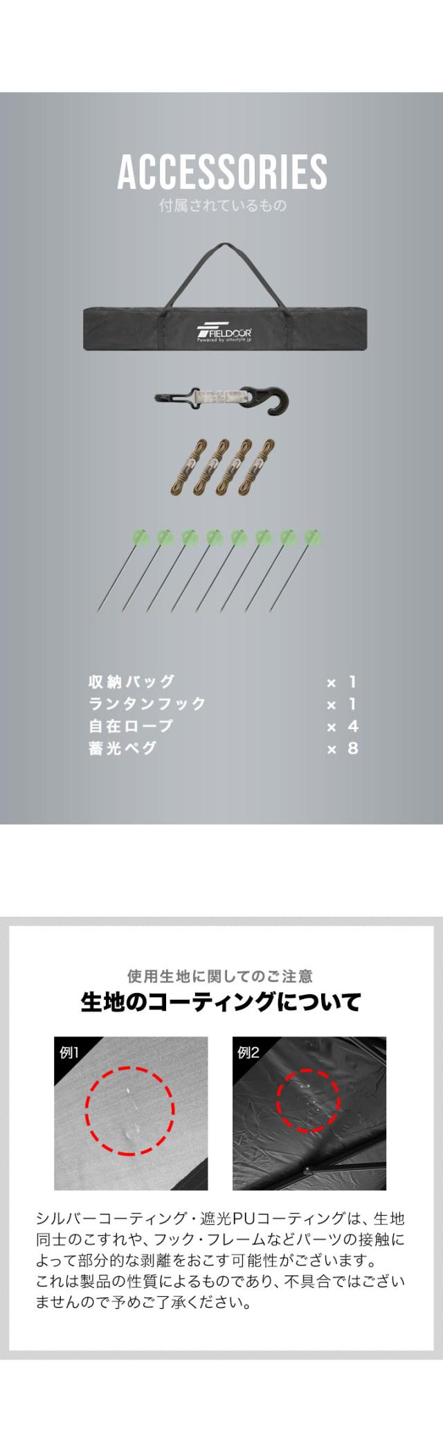 | 付属品: ・専用収納バッグ ×1 ・ランタンフック ×1 ・ロープ ×4 ・蓄光スチールペグ ×8 |