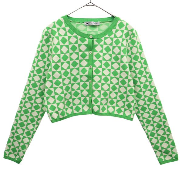 ザラ 総柄 長袖 ニットカーディガン S グリーン×ホワイト ZARA レディース