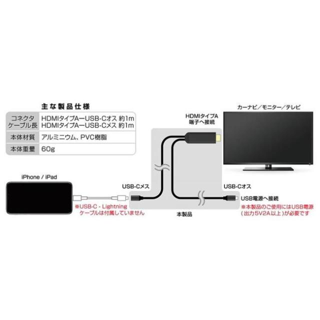 HDMI変換ケーブル iPhone iPad専用 USB-C中継 ミラーリング スマホ カーナビ テレビに映す 動画 写真 アプリ