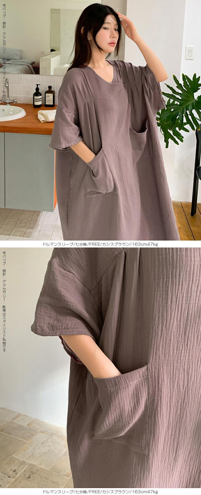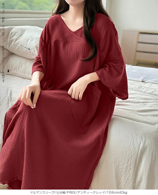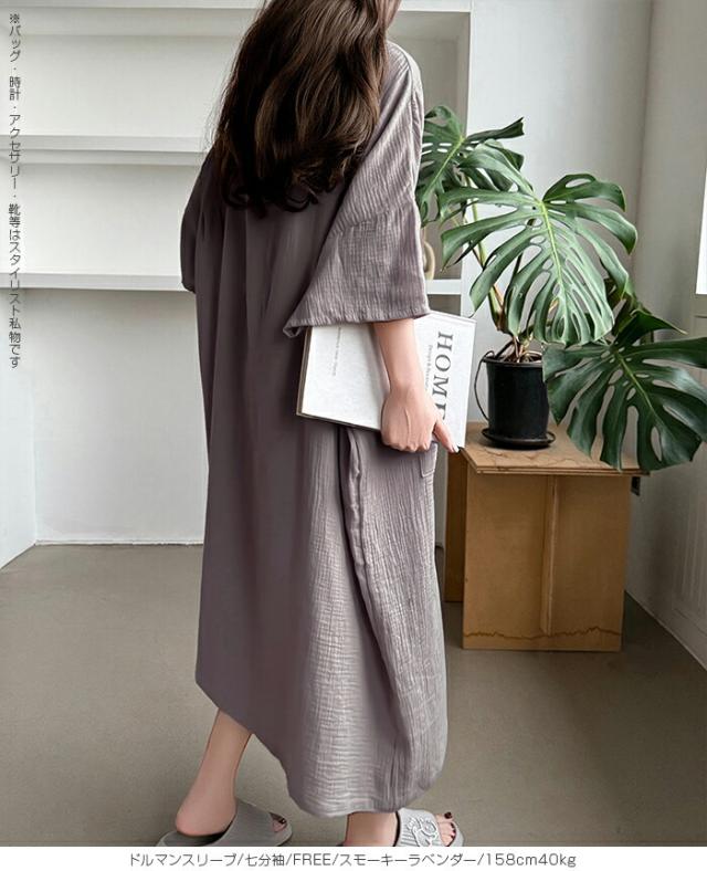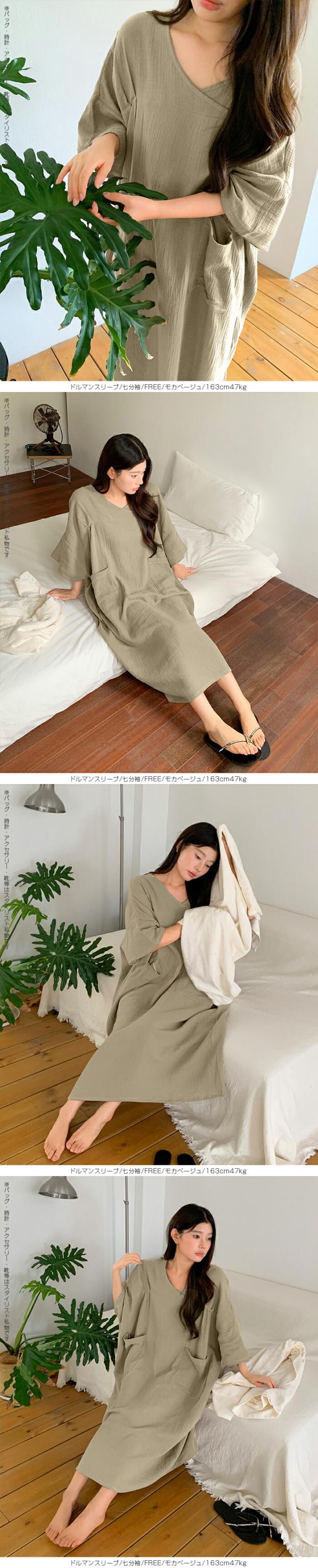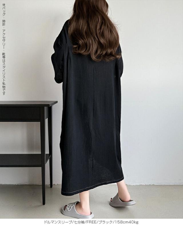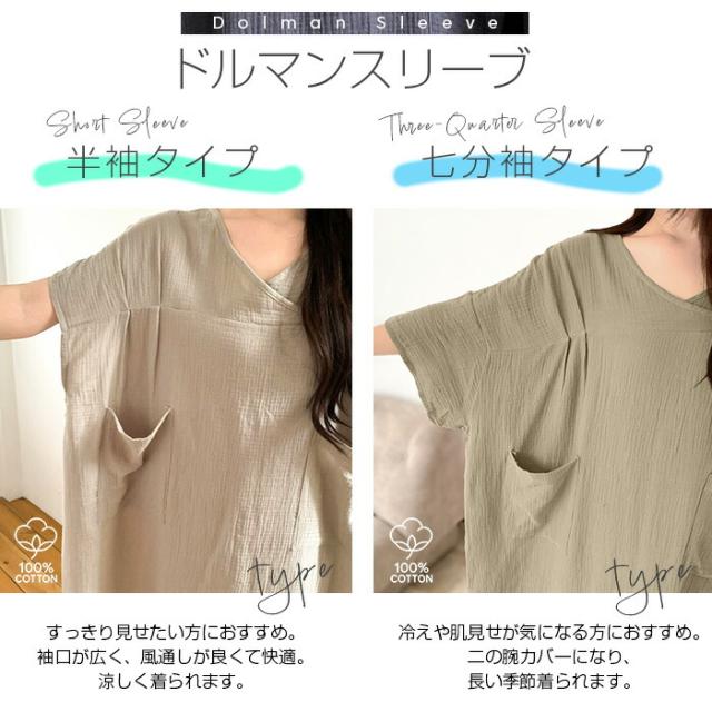 【 お風呂上りガーゼワンピース 】 肌に優しい綿100%素材を使用したガーゼワンピース。 吸水性と通気性に優れたガーゼ生地は、 お風呂上がりやリラックスタイムに最適です。 選べる2タイプ(ドルマンスリーブ半袖/ドルマンスリーブ七分袖)をご用意し、 季節や好みに合わせて快適に着用いただけます。 心地よい肌触りと優しい風合いが特徴の、 日常の癒しを提供するアイテムです。 柔らかなガーゼ素材が肌に優しくフィットし、 入浴後のリラックスタイムをさらに快適に演出します。 シンプルでありながら上品なデザインで、着るだけで身も心もリフレッシュできる一着です。 家でのくつろぎ時間や旅先でのリゾート感を演出する、贅沢なひとときを提供します。 商品ポイント 選べる2タイプ:半袖・七分袖(春夏向け)から選択可能 綿100%ガーゼ素材:肌あたりが柔らかく、吸湿性・通気性に優れた快適生地 ゆったりシルエット:リラックス感がありながら体型カバーも叶う お風呂上がりにも最適:サラッと羽織れてすぐに快適なルームウェア 多用途:部屋着、パジャマ代わり、ワンマイルウェアにぴったり デザイン・シルエット ドルマンスリーブ半袖:ゆったりとした袖で夏でも涼しく、汗をかいても快適。 ドルマンスリーブ七分袖:肌寒い季節や冷房対策に重宝する万能デザイン。 |
