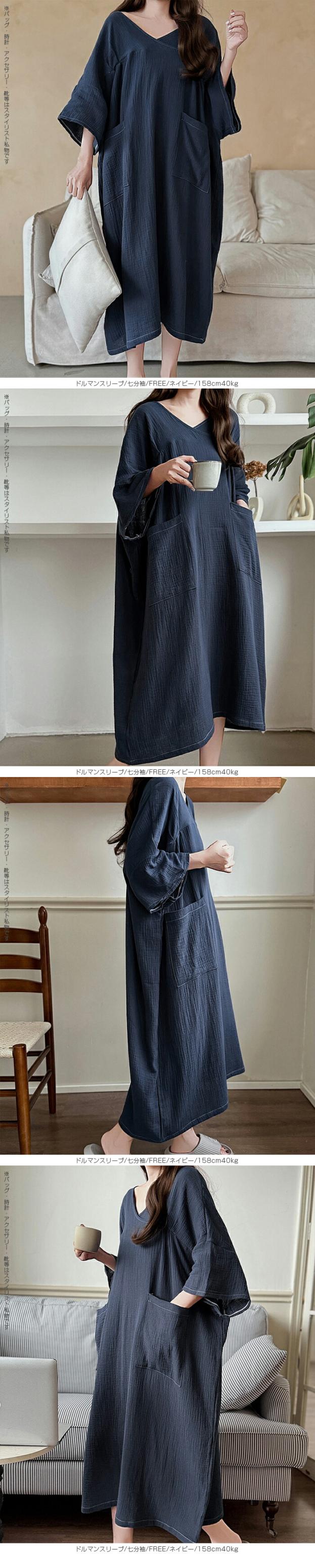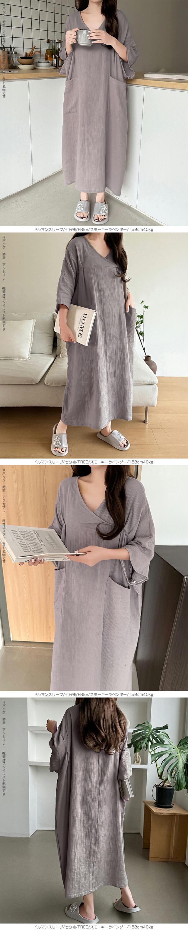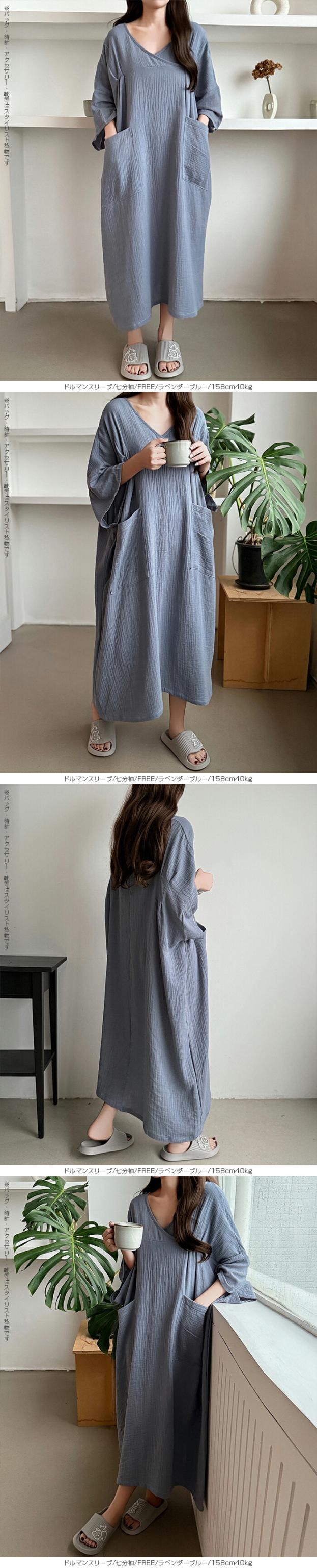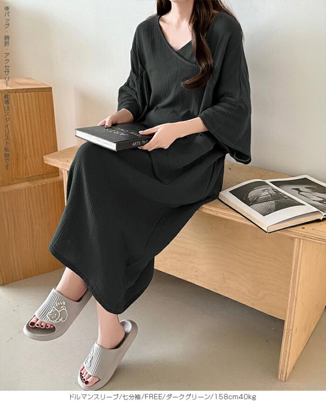 【 お風呂上りガーゼワンピース 】 肌に優しい綿100%素材を使用したガーゼワンピース。 吸水性と通気性に優れたガーゼ生地は、 お風呂上がりやリラックスタイムに最適です。 選べる2タイプ(ドルマンスリーブ半袖/ドルマンスリーブ七分袖)をご用意し、 季節や好みに合わせて快適に着用いただけます。 心地よい肌触りと優しい風合いが特徴の、 日常の癒しを提供するアイテムです。 柔らかなガーゼ素材が肌に優しくフィットし、 入浴後のリラックスタイムをさらに快適に演出します。 シンプルでありながら上品なデザインで、着るだけで身も心もリフレッシュできる一着です。 家でのくつろぎ時間や旅先でのリゾート感を演出する、贅沢なひとときを提供します。 商品ポイント 選べる2タイプ:半袖・七分袖(春夏向け)から選択可能 綿100%ガーゼ素材:肌あたりが柔らかく、吸湿性・通気性に優れた快適生地 ゆったりシルエット:リラックス感がありながら体型カバーも叶う お風呂上がりにも最適:サラッと羽織れてすぐに快適なルームウェア 多用途:部屋着、パジャマ代わり、ワンマイルウェアにぴったり デザイン・シルエット ドルマンスリーブ半袖:ゆったりとした袖で夏でも涼しく、汗をかいても快適。 ドルマンスリーブ七分袖:肌寒い季節や冷房対策に重宝する万能デザイン。 |