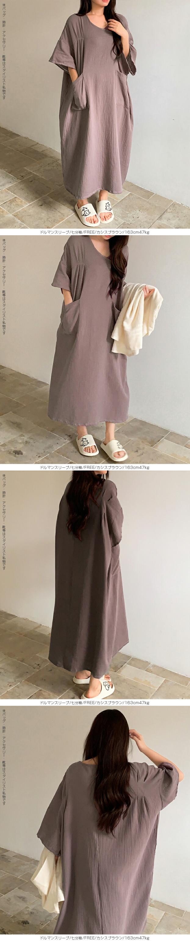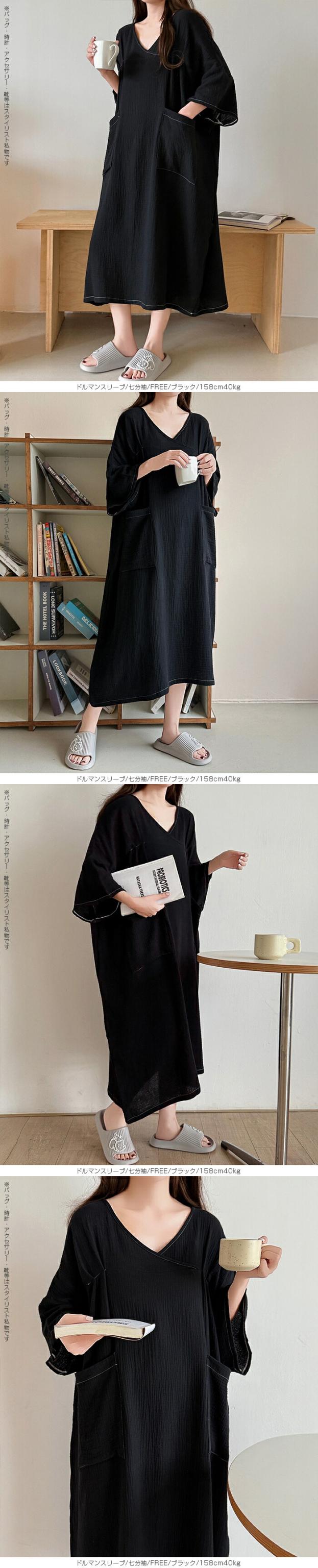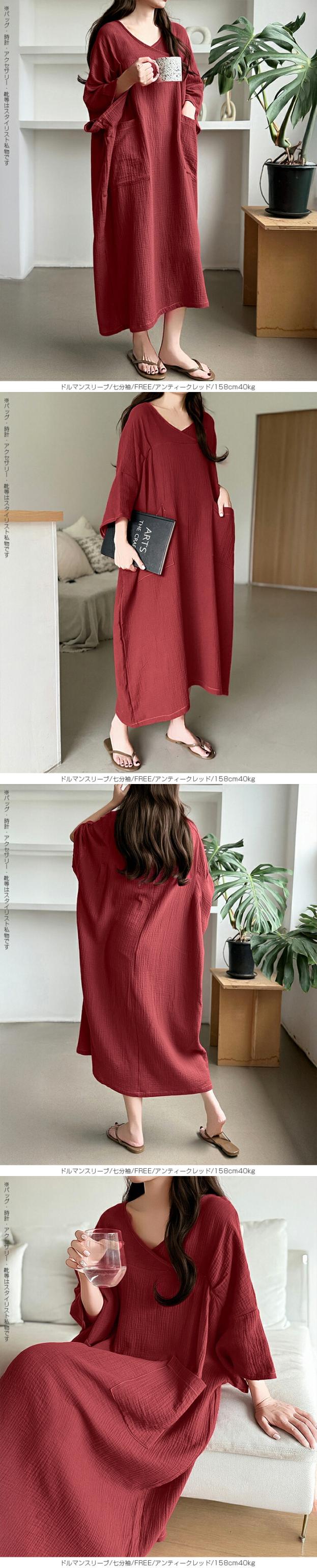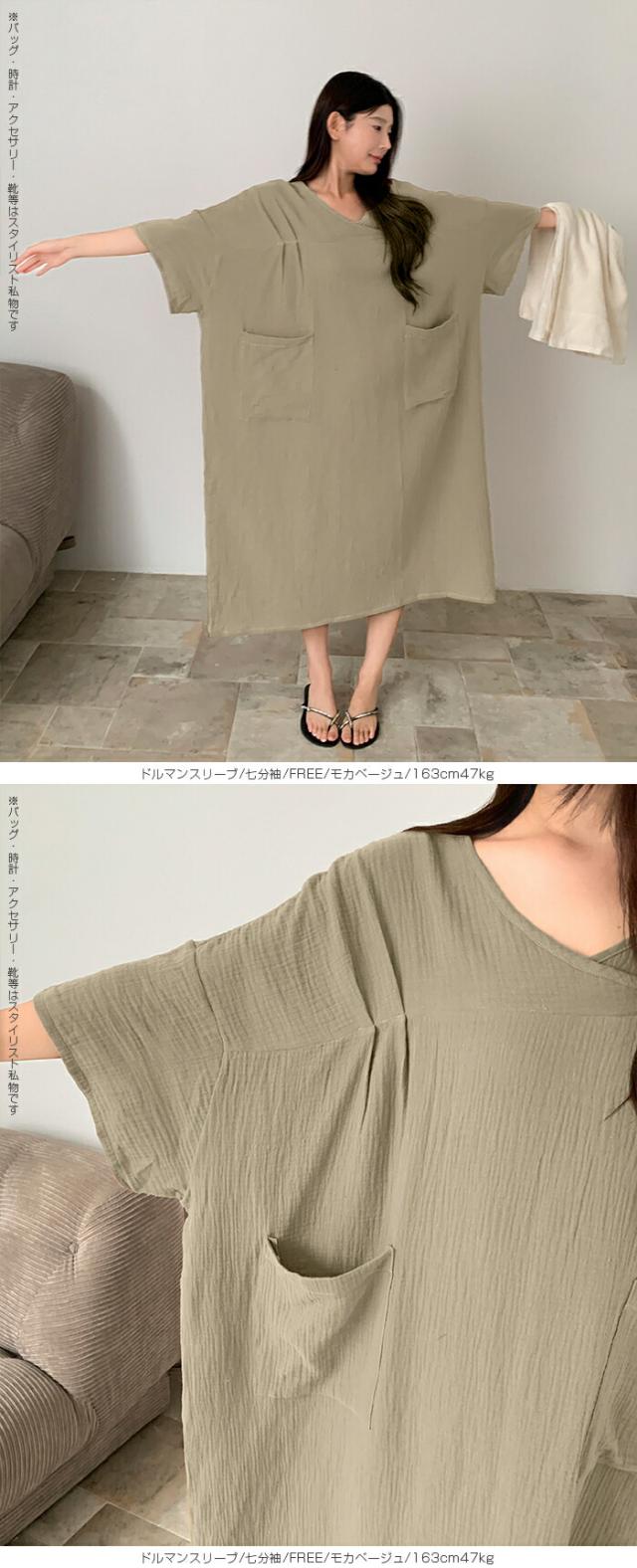 【 お風呂上りガーゼワンピース 】 肌に優しい綿100%素材を使用したガーゼワンピース。 吸水性と通気性に優れたガーゼ生地は、 お風呂上がりやリラックスタイムに最適です。 選べる2タイプ(ドルマンスリーブ半袖/ドルマンスリーブ七分袖)をご用意し、 季節や好みに合わせて快適に着用いただけます。 心地よい肌触りと優しい風合いが特徴の、 日常の癒しを提供するアイテムです。 柔らかなガーゼ素材が肌に優しくフィットし、 入浴後のリラックスタイムをさらに快適に演出します。 シンプルでありながら上品なデザインで、着るだけで身も心もリフレッシュできる一着です。 家でのくつろぎ時間や旅先でのリゾート感を演出する、贅沢なひとときを提供します。 商品ポイント 選べる2タイプ:半袖・七分袖(春夏向け)から選択可能 綿100%ガーゼ素材:肌あたりが柔らかく、吸湿性・通気性に優れた快適生地 ゆったりシルエット:リラックス感がありながら体型カバーも叶う お風呂上がりにも最適:サラッと羽織れてすぐに快適なルームウェア 多用途:部屋着、パジャマ代わり、ワンマイルウェアにぴったり デザイン・シルエット ドルマンスリーブ半袖:ゆったりとした袖で夏でも涼しく、汗をかいても快適。 ドルマンスリーブ七分袖:肌寒い季節や冷房対策に重宝する万能デザイン。 |