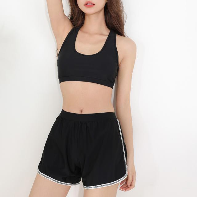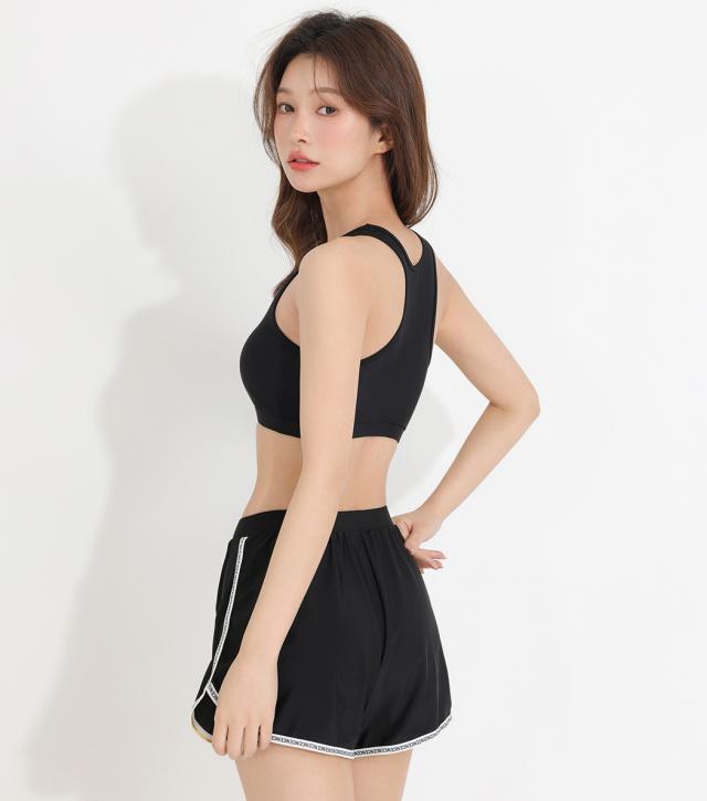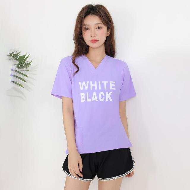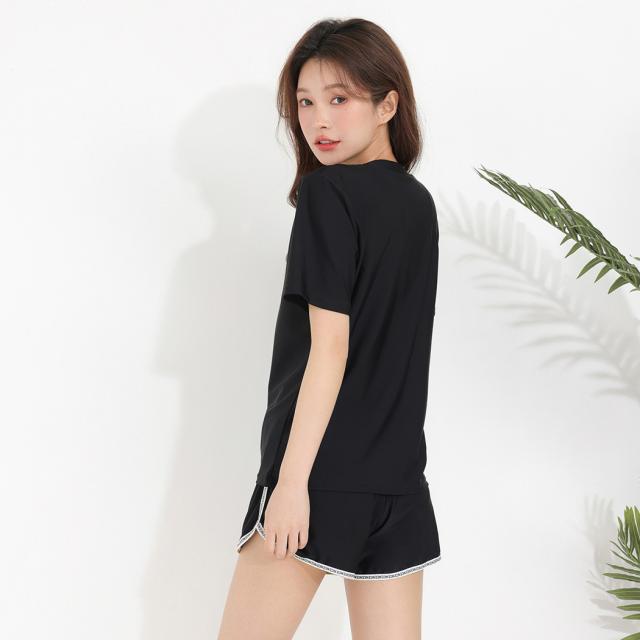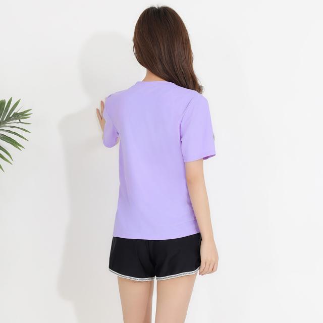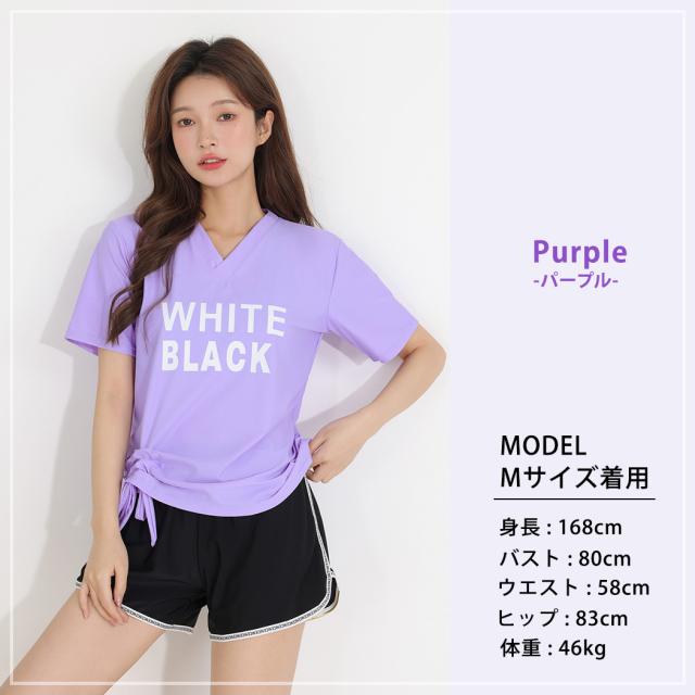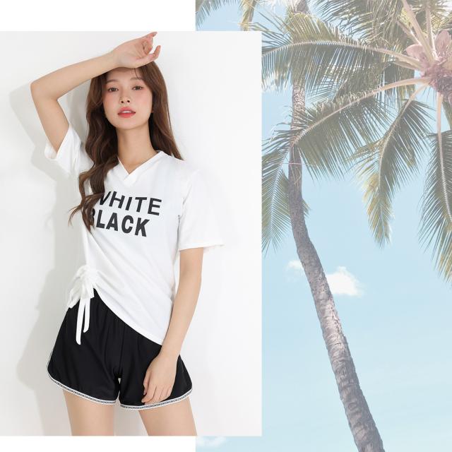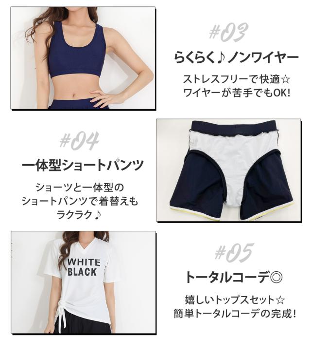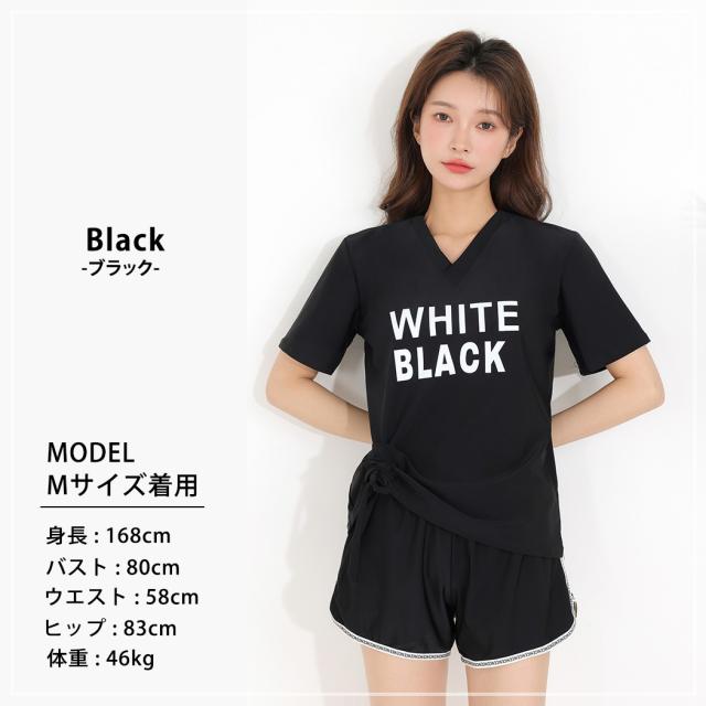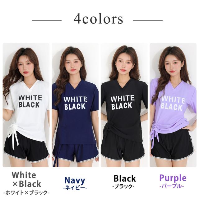 春新作 水着 レディース 体型カバー セパレート 3点セット トップス 半袖 ビキニ ブラ ショーツ一体型 ショートパンツ Vネック ロゴ リボン パイピング バイカラー ノンワイヤー パッド付き 二の腕 お腹 ウエスト ヒップ 脚 カバーアップ