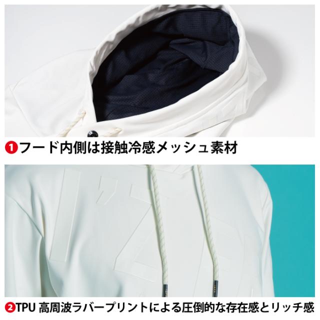 ◇首元に接触するフード内側には接触冷感機能を有するナイロンメッシュ素材を採用し・快適性とデザイン性を追求。