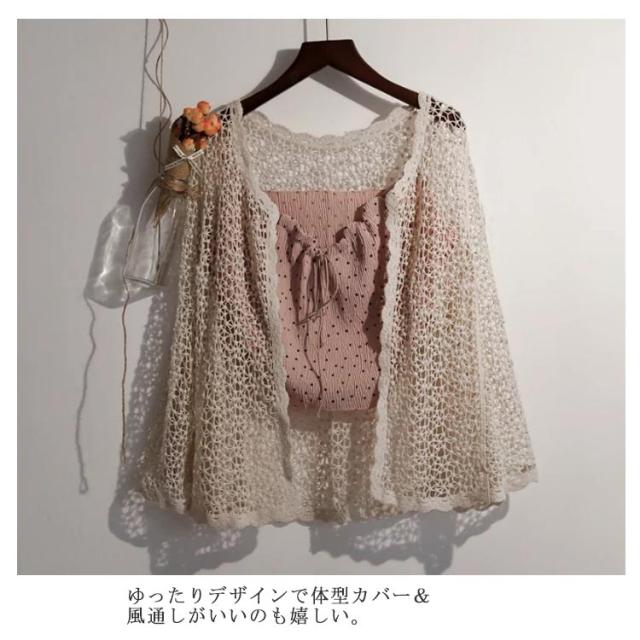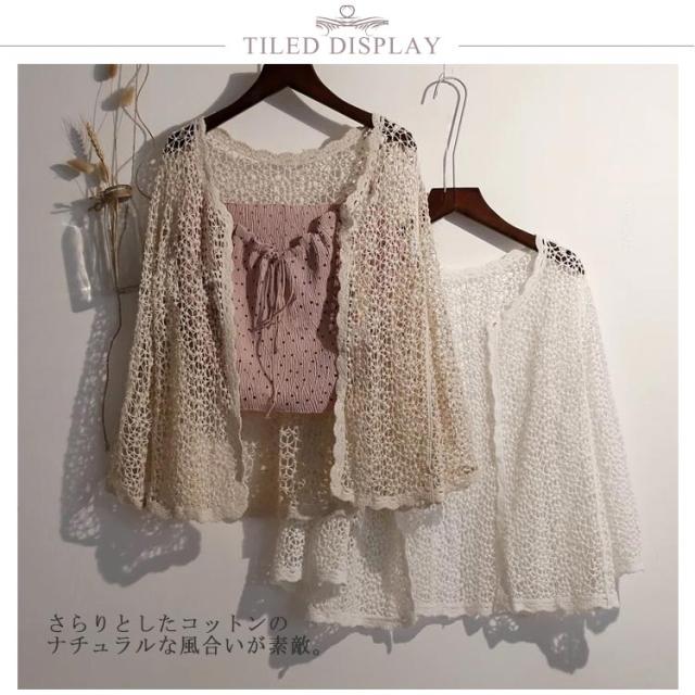 | 透かし編みのコットンレースサマーカーディガン。 さらりとしたコットンのナチュラルな風合いが素敵。 ゆったりデザインで体型カバー&風通しがいいのも嬉しい。 夏のUV対策や冷房対策にぴったりの便利な一着。 | |