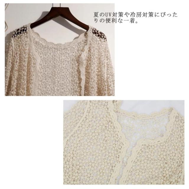 涼しい ボレロ 透かし編み カーディガン 七分袖 サマーカーディガン サマー レース 冷房対策 スカラップ サマーカーディガン シースルー 羽織り 春 夏 可愛い ナチュラル