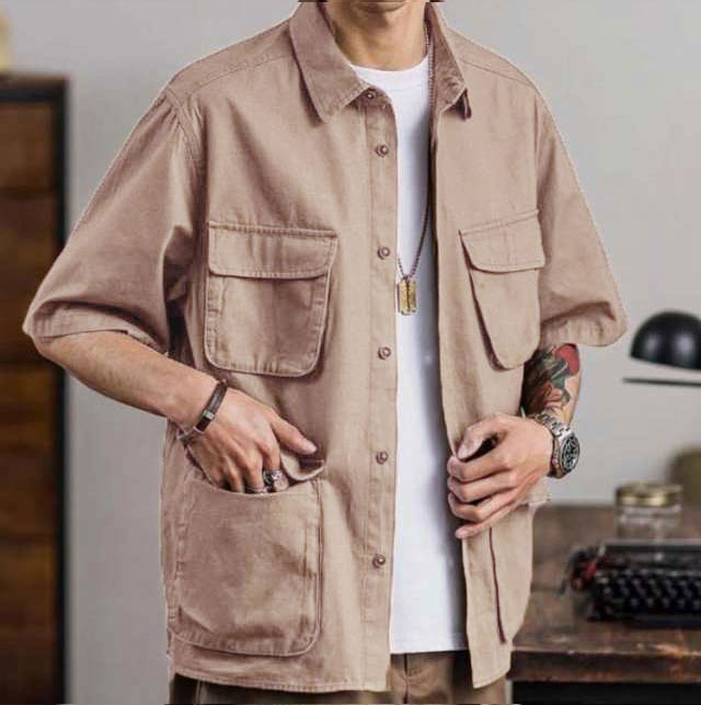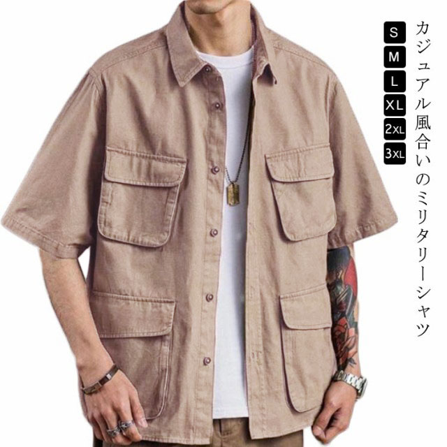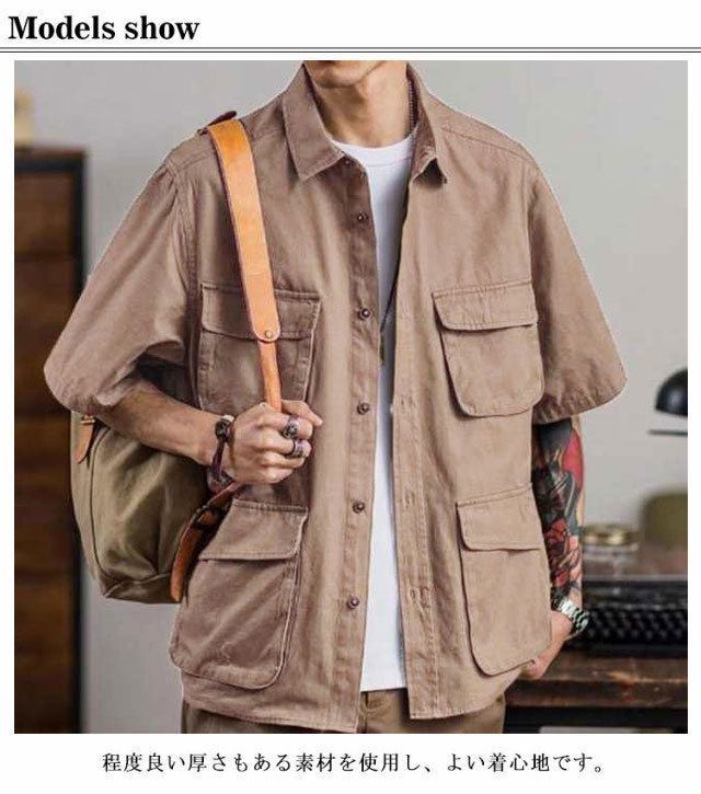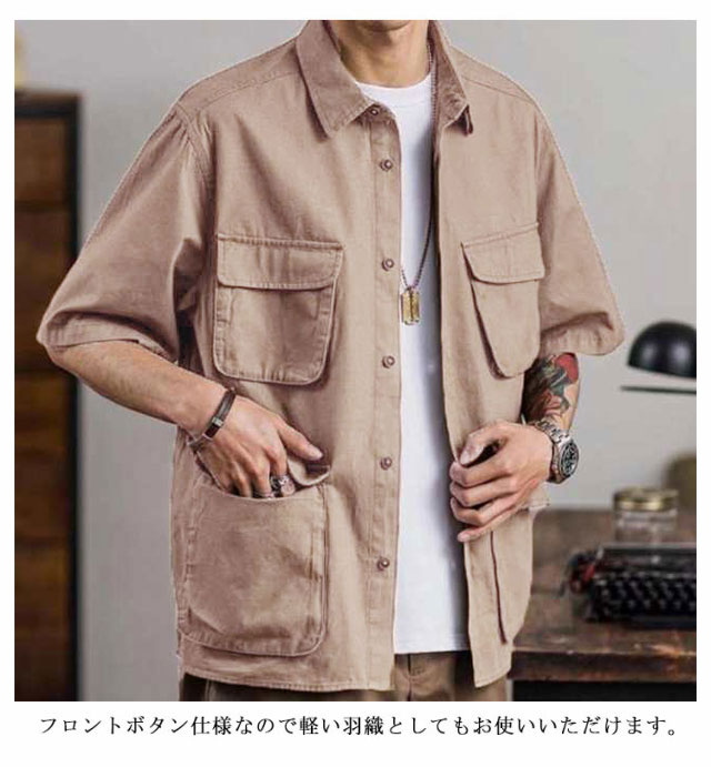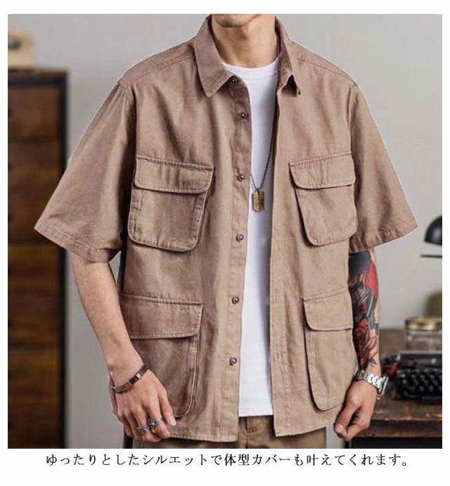 半袖シャツ メンズ カジュアルシャツ 半袖 Tシャツ ワークシャツ ミリタリー 折り襟 ポケット付き トップス 開襟シャツ ゆったり 大きいサイズ 無地 羽織り ライトアウター 春夏秋 カジュアル シンプル おしゃれ B系 お兄系 夏服 送料無料