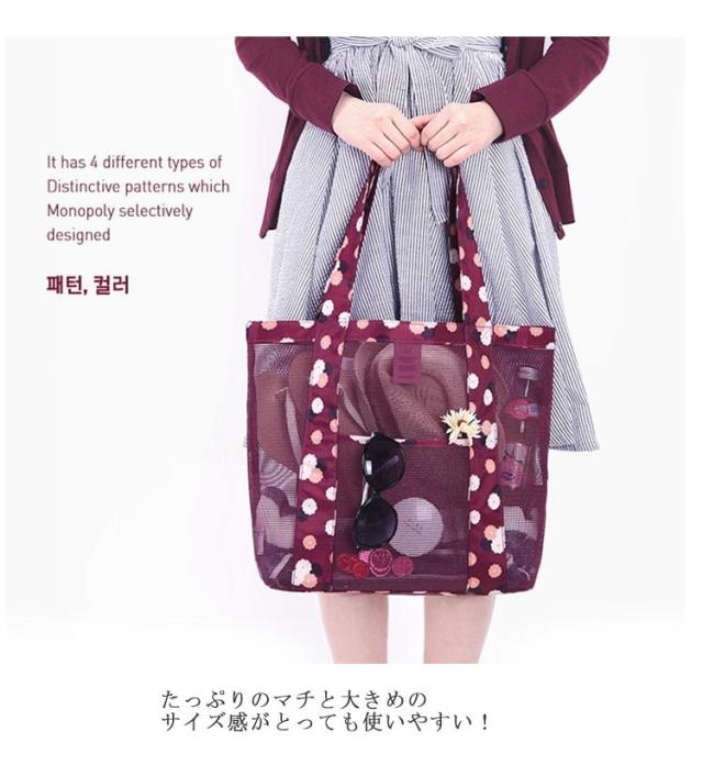 | おしゃれなメッシュ素材のビーチバッグ。 通気性、速乾性抜群で濡れた物を入れても大丈夫♪ たっぷりのマチと大きめのサイズ感がとっても使いやすい! これ1つあれば、ビーチに必要なモノが全部入っちゃいます♪ 海、プール、フィットネス、温泉などで大活躍、 日常にも使えて便利なバッグです。 | |