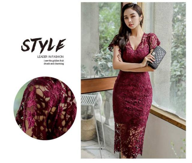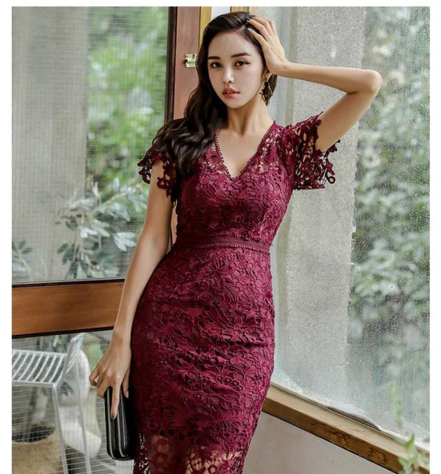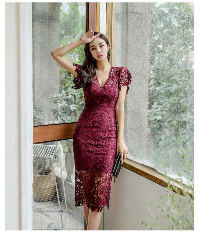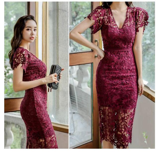 ワンピース 半袖 ドレス 総レース レディース パーティードレス タイトスカート Vネック 大きいサイズ ひざ丈ドレス レーススカート 花柄 上品 タイトワンピース セクシー 清楚 結婚式 二次会 お呼ばれ 謝恩会
