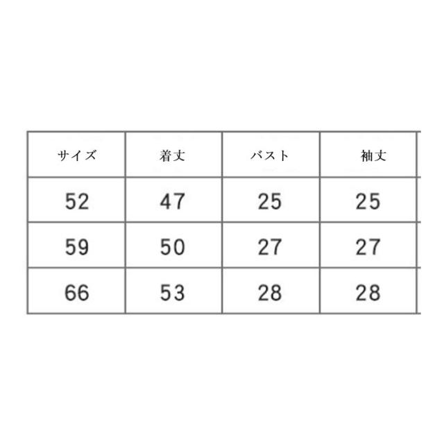 | サイズについての説明 | 52 総丈47cm バスト25cm 袖丈25cm 推奨0-1ヶ月 59 総丈50cm バスト27cm 袖丈27cm 推奨0-2ヶ月 66 総丈53cm バスト28cm 袖丈28cm 推奨0-4ヶ月 |