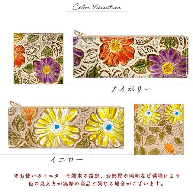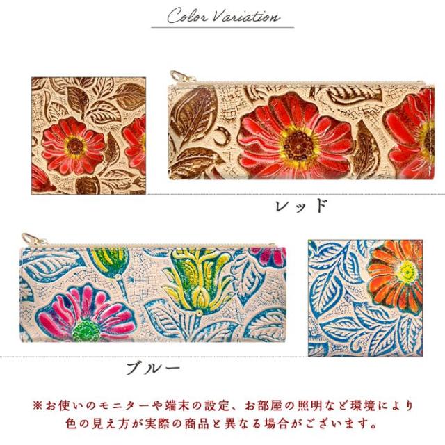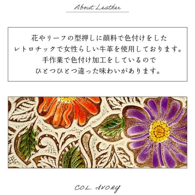 花やリーフの型押しに顔料で色付けをしたレトロチックで女性らしい牛革を使用しております。
