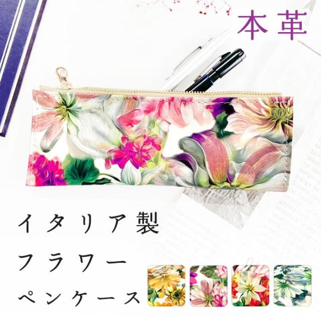 本革 ペンケース 花柄 イタリア製 フラワー 筆箱 ふで箱 レザー おしゃれ ペン入れ コンパクト ペン ケース スリム 文具 筆記用具 収納 革 上品 お洒落