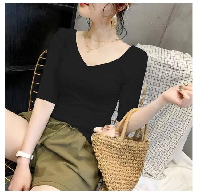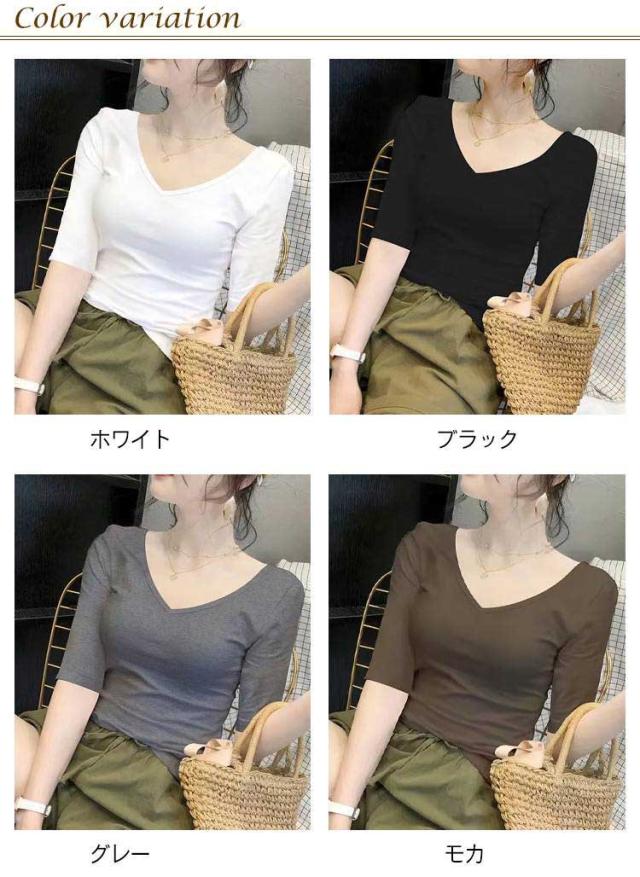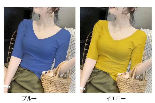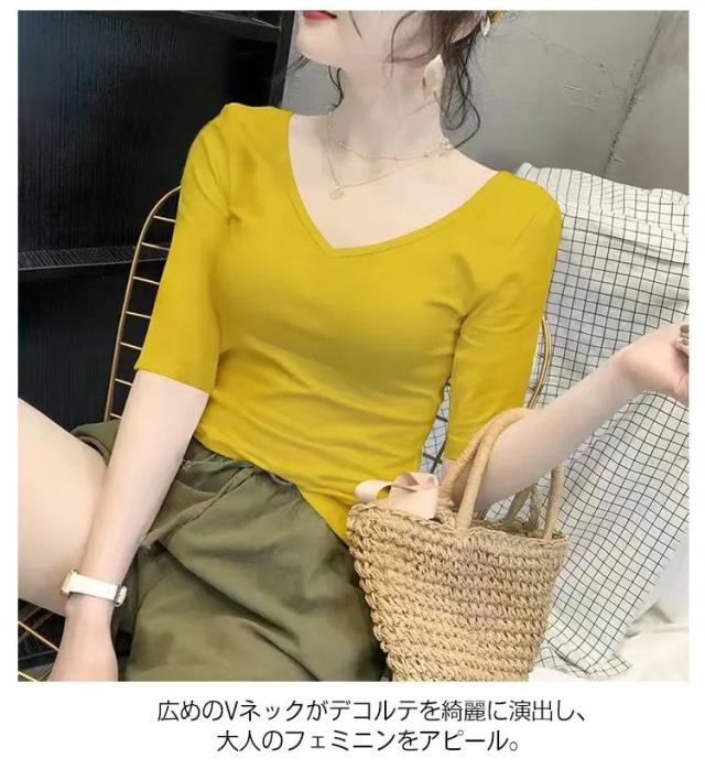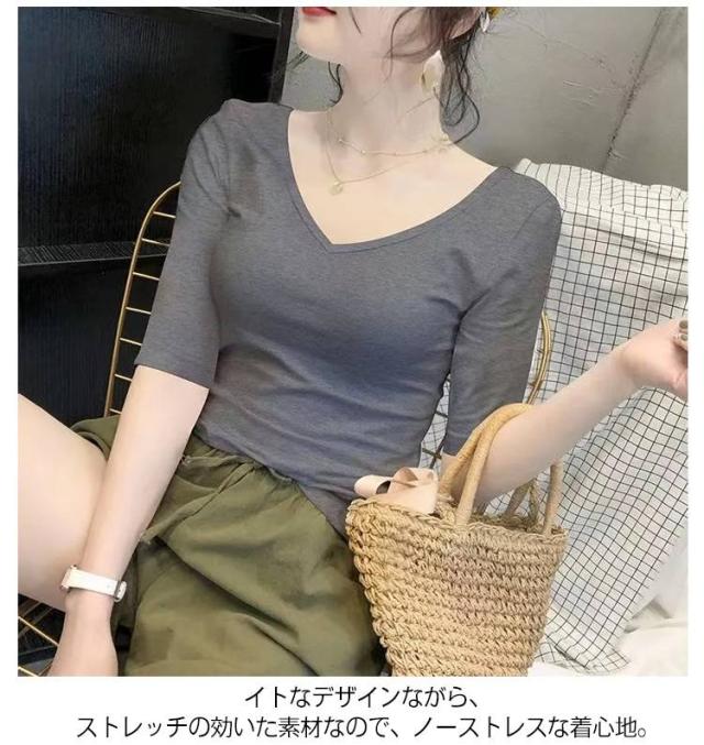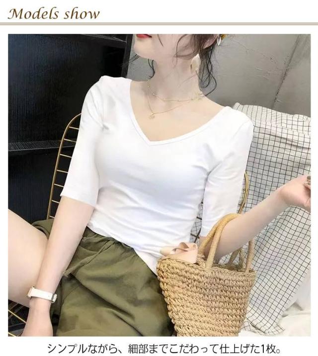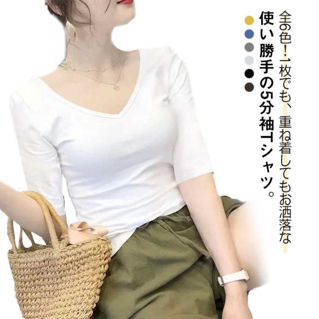 5分袖カットソー レディース tシャツ カットソー 五分袖 トップス Vネック コンパクト 透けなし 春 夏 秋 ストレッチ シンプル おしゃれ 無地 送料無料