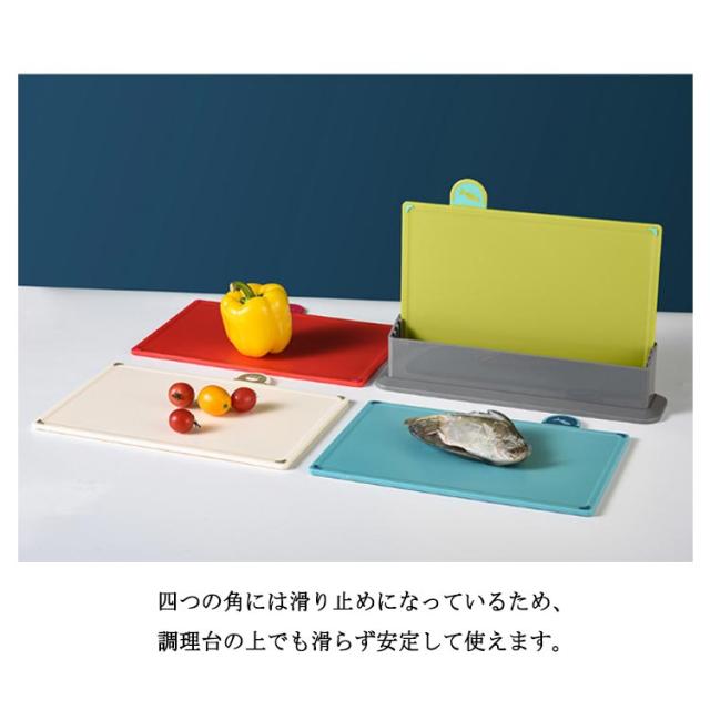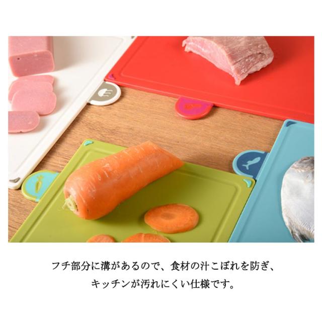| 素材に合わせて使い分けが出来る、うれしい4枚セットです。【スタンド付き】 野菜・肉魚・薬味など、食材に合わせて使い分けしやすいまな板セット。 フチ部分に溝があるので、食材の汁こぼれを防ぎ、キッチンが汚れにくい仕様です。 四つの角には滑り止めになっているため、調理台の上でも滑らず安定して使えます。 まな板はリバーシブル仕様です。 軽いため、食材を鍋などに移すのも楽々。 | |