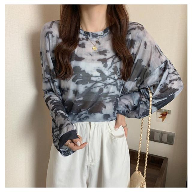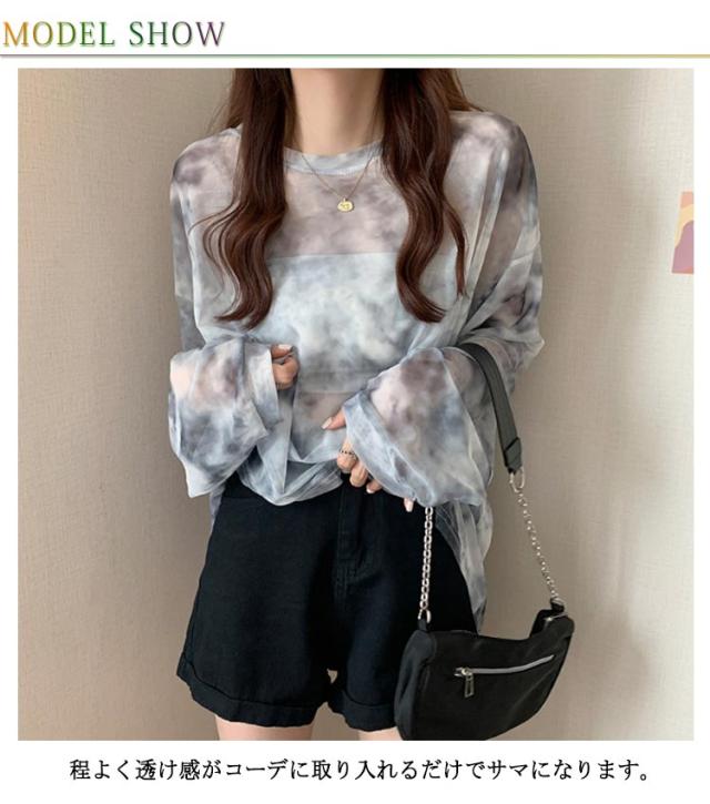 タイダイ柄 シアートップス レディース 長袖 透け感 チュール Tシャツ カットソー 春夏 薄手 ロンT シースルー トップス ゆったり ドロップショルダー クールネック UVカット 日焼け対策 おしゃれ 韓国ファッション
