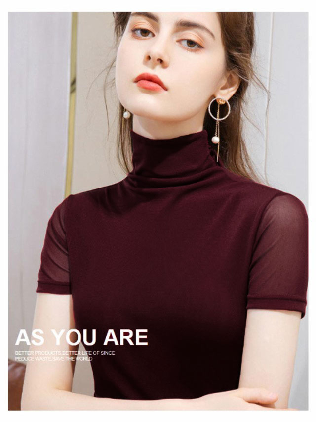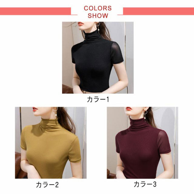 フィット レディース 半袖tシャツ カットソー ストレッチ Tシャツ 半袖 タートルネック 半袖 メッシュ素材 無地 インナー ハイネックtシャツ レイヤード 重ね着 ハイネック 半袖 スリム 大きいサイズ 春夏 トップス 送料無料