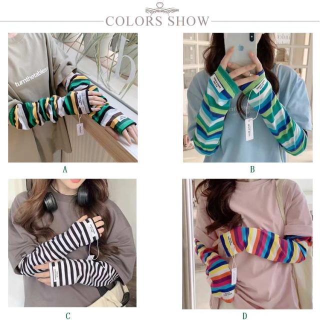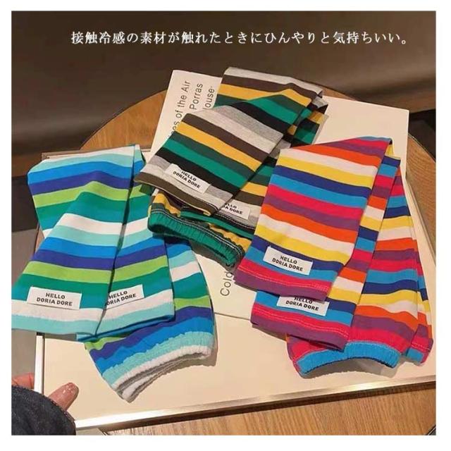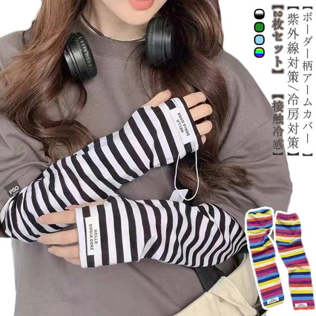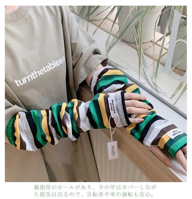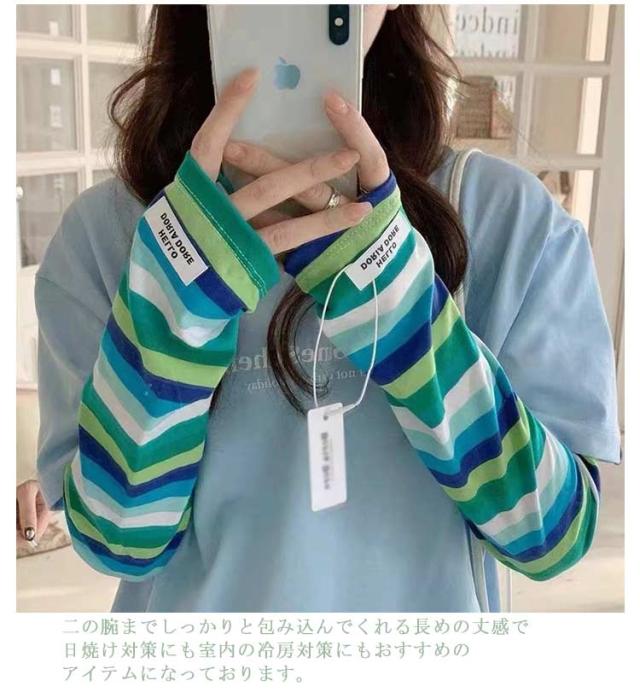 UVカット 接触冷感 アームカバー ボーダー柄 レディース 涼しい 通勤 散歩 自転車 日焼け対策 UV対策 アームカバー 指あり 春夏 UVカット ロング 涼しい おしゃれ UV手袋 腕カバー 4色 カラフル 送料無料