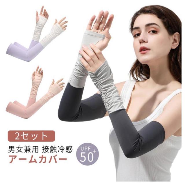 2セット アームカバー UVカット UPF50+ 接触冷感 レディース メンズ 指穴付きアームカバー 冷感アームカバー ロング 手袋 スマホ 対応 指なし 指出し おしゃれ 配色 可愛い アウトドア 運転 スポーツ 自転車 ゴルフ UV 紫外線