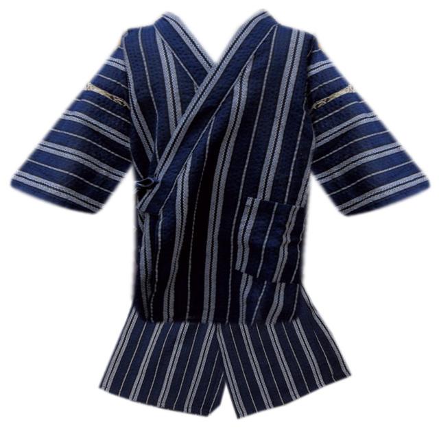 甚平 じんべい 子供用 キッズ 男の子 綿麻 しじら織 濃青白黒ライン 130cm 140cm 150cm ジュニア 男児