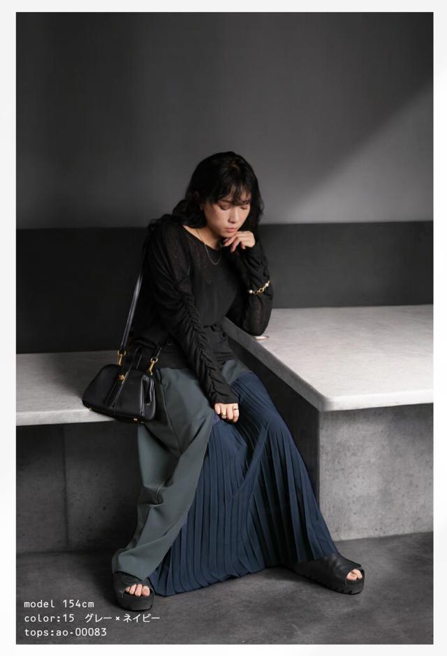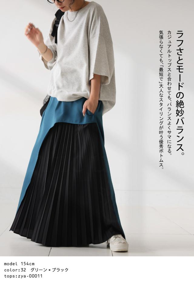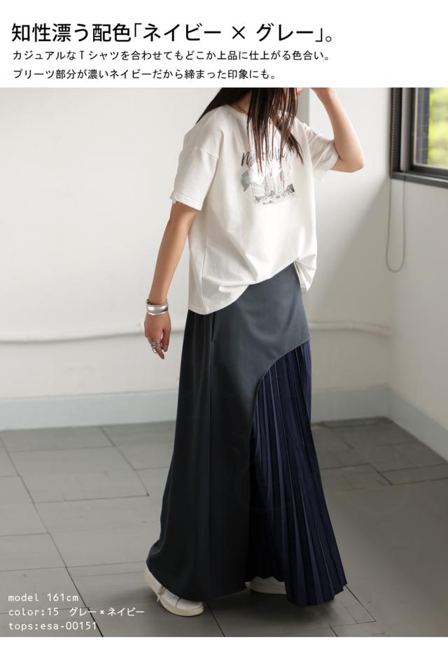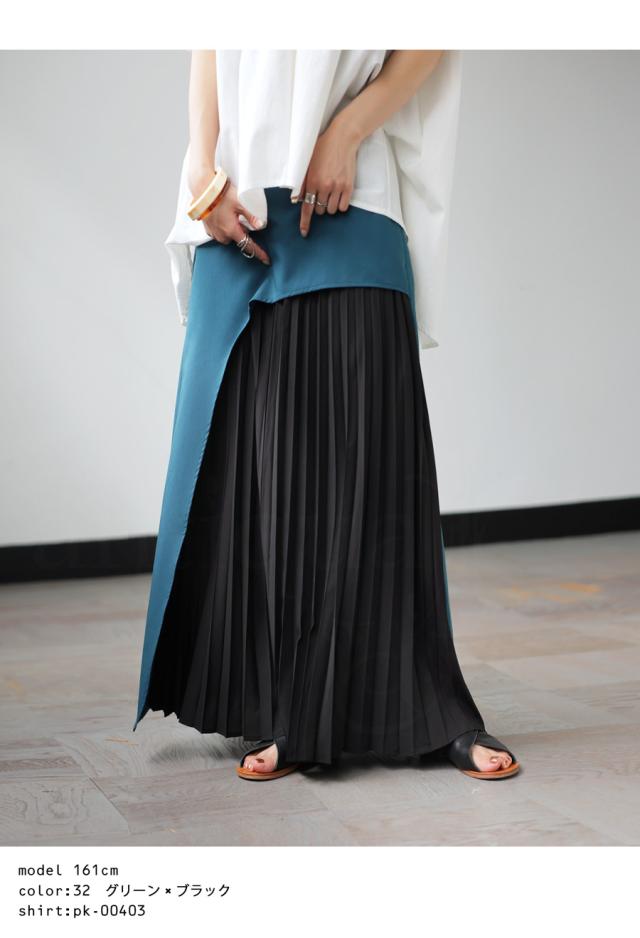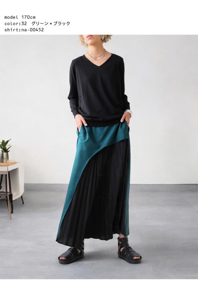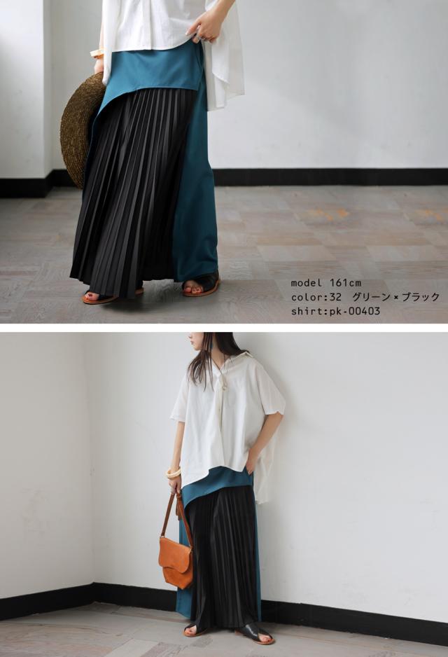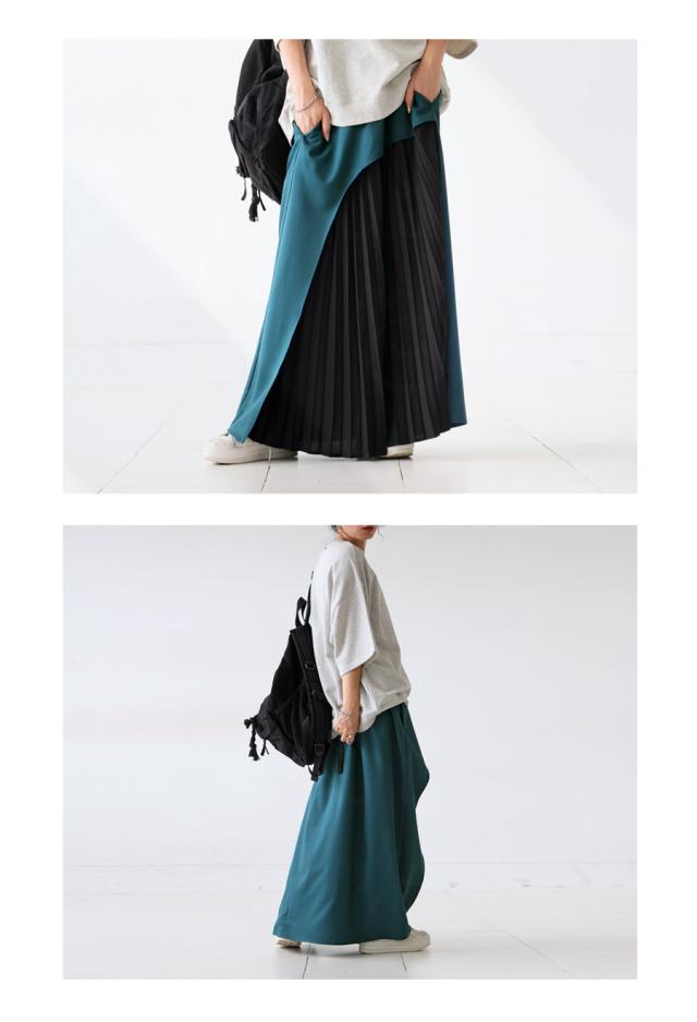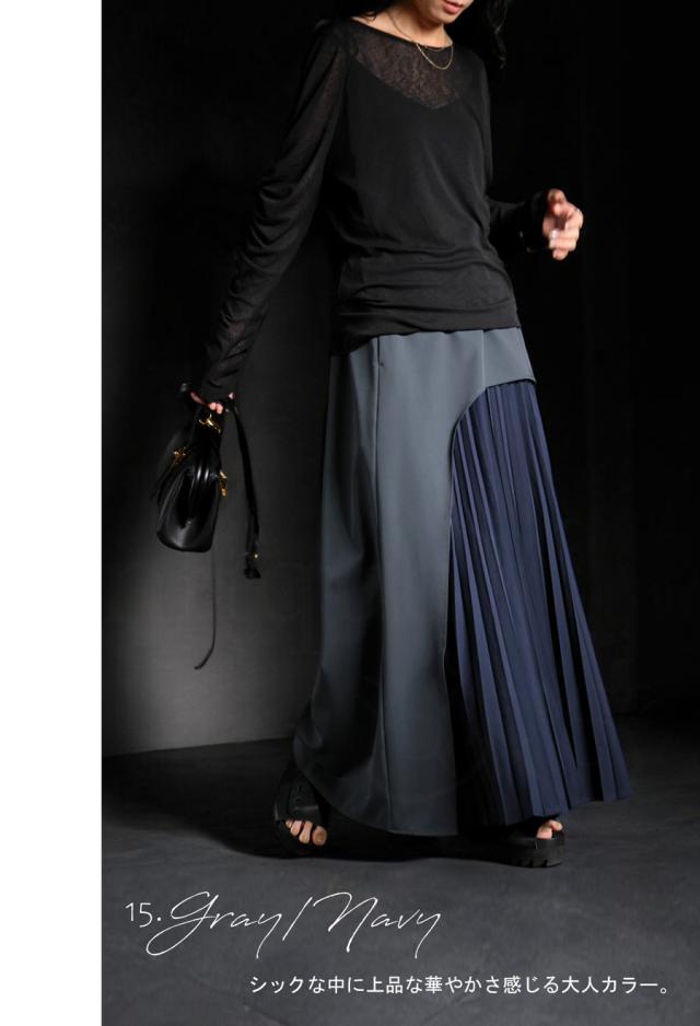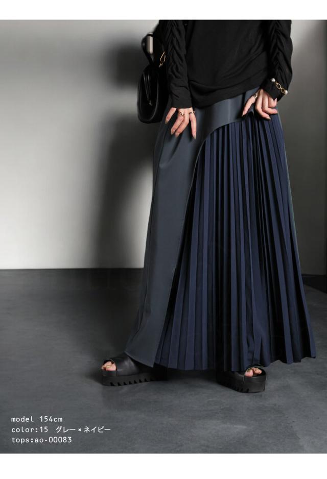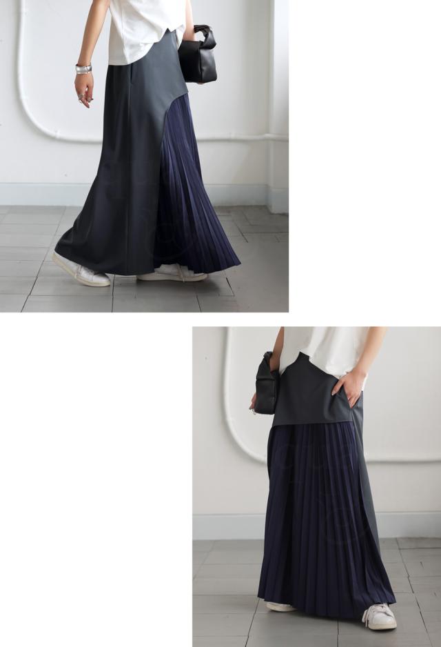 pk-01177 ロング 配色 カーブ カーブデザイン アシメ Aライン プリーツ ゆったり シンプル きれいめ モード ラフ 体型カバー 細見え 華奢見え 大きめ マキシ丈 デザインスカート
