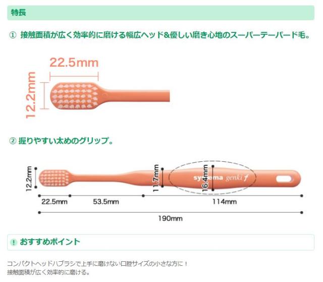 コンパクトヘッド歯ブラシで上手く磨けない方のための歯ブラシ.口腔サイズの小さい方、女性の方にはゲンキ(genki)より ヘッド部を小さくした本品ゲンキ エフ(genki f)がおすすめです