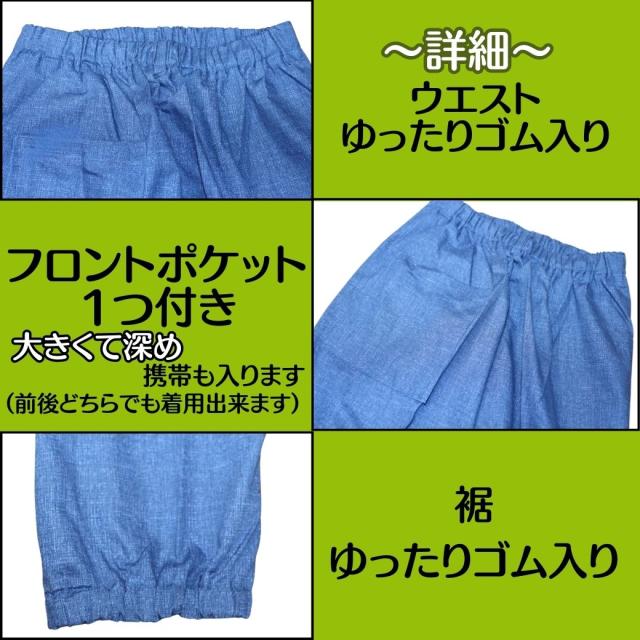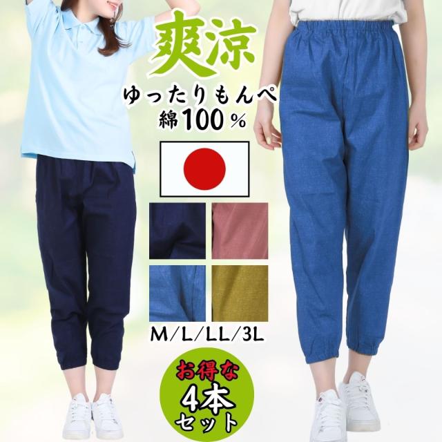 【カラー】 1.ブルー2.ネイビー3.オレンジ4.グリーン【柄】無地日本製 和風無地和風もんぺ。涼しく動きやすい。前側片ポケット付き。【サイズ】Mサイズ ウエスト64.0-70.0ヒップ87.0-95.0股下59.0 Lサイズ ウエスト69.0-77.0ヒップ92.0-10股下60.0 LLサイズ ウエスト77.0−85.0ヒップ97.0-105股下62.0 3Lサイズ ウエスト85.0-93.0ヒップ102-110股下65.0 【ウェストの締め方】 総ゴム素材【生地】綿 100% 和風無地【裾の長さ(丈)】 10分丈【シーズン】夏・春・秋【テイスト(ファッション)】カジュアル 和風【生産国】日本【商品説明】 こちらのもんぺは、夏に涼しいもんぺ レディースです。おうち時間をゆったりとあなたらしく過ごして頂くためのリラパンです。農作業 ズボンとしてもとても涼しく、過ごしていただける商品です。農作業を涼しいく、あなたの時間の意手伝い、お悩み解決レディース もんぺでございます。