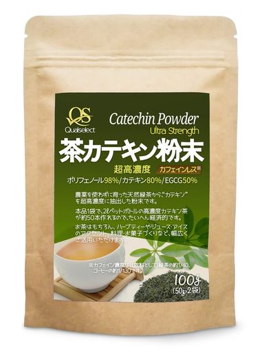 QUALSELECT(クオルセレクト) 茶カテキン粉末 100G 超高濃度 (2LX50本=100L分) ポリフェノール98%パウダー カフェインレス カテキン80%(ガレート型:EGCG50%) 無農薬 天然緑茶由来エキス 原料原末