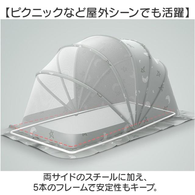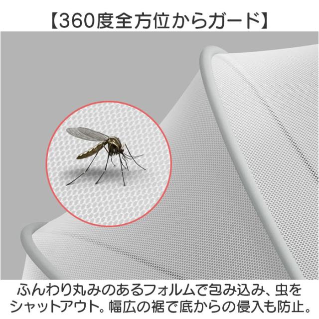 | 商品説明 | 【おやすみ中のベビーを蚊から保護】 ・蚊などの小さな虫の侵入を防ぐ!「折り畳み式蚊帳」が新登場。 【面倒な組立不要!ラクラク開閉】 ・サッと広げて寝ている赤ちゃんに被せるだけ。使わない時は折りたたんでスリムにひとまとめ。 (※1)まとめるボタンの有無は、カラーにより異なります。 【360度全方位からガード】 ・ふんわり丸みのあるフォルムで包み込み、虫をシャットアウト。幅広の裾で底からの侵入も防止。 【赤ちゃんが起き上がっても大丈夫】 ・程よく高さのあるドーム型で、頭をぶつけたりする心配が不要。 (※2)月齢により異なりますので、ご注意願います。 【暑い季節も心地よい睡眠をサポート】 ・足側は通気性に優れつつ、虫を侵入させない六角メッシュ。風が優しく通り、息苦しさもゼロ。 【顔まわりを光などから守る仕様】 ・頭部側には透け感のない生地を使用。光や風が顔まわりに当たるのを防いでくれて安心。 【ピクニックなど屋外シーンでも活躍】 ・両サイドのスチールに加え、5本のフレームで安定性もキープ。 【シンプルなナチュラルデザイン】 ・インテリアの邪魔をしない、優しげなカラーリング。赤ちゃんと過ごす夏の必需品! |