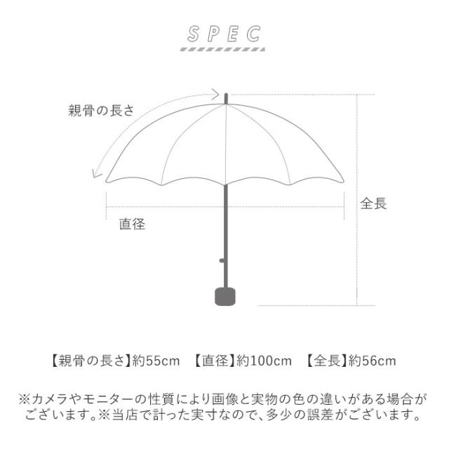 | サイズ | [親骨の長さ]約55cm/[直径]約100cm/[全長]約56cm [収納時の長さ]約26cm [収納時の幅]約7cm 【収納袋】 [縦]約27cm/[横(底部)]約18cm/[マチ]約3cm [持ち手]約30cm ※サイズは当店計測の実寸サイズです。実際の商品ならびにメーカー表記サイズとは多少の誤差が生じる場合がございます。あらかじめご了承ください。 |